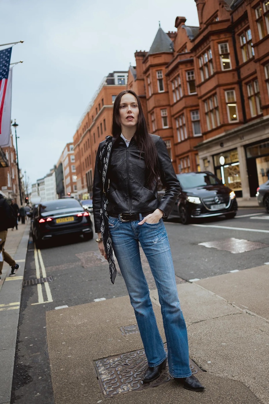켄달이 좋아하는 미니멀리스트의 시선을 사로잡은 룩입니다. 일자로 곧게 뻗은 시가렛 진 스타일에 부츠를 매치한 뒤, 올해 내내 유행할 레더 재킷을 걸쳐주는 거죠. 상의가 짧을수록 다리 길이는 더 길고 얇아 보입니다. 다리 길이에 집착하는 저는 굽이 있는 뾰족한 부츠를 신을 거예요.