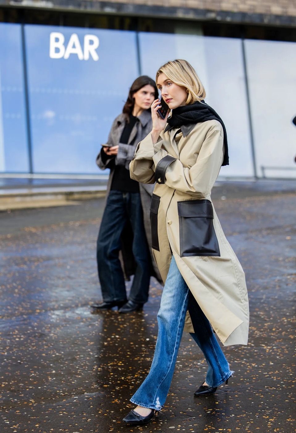 아직 유행하지는 않았지만 2026 가장 트렌디한 청바지 룩의 표본입니다. 다시 시작된 트렌치 코트의 흐름에 부츠컷 청바지, 펌프스를 매치했죠. 펌프스가 부담스럽다면 플랫 슈즈로 대체해도 비슷한 무드가 유지됩니다.