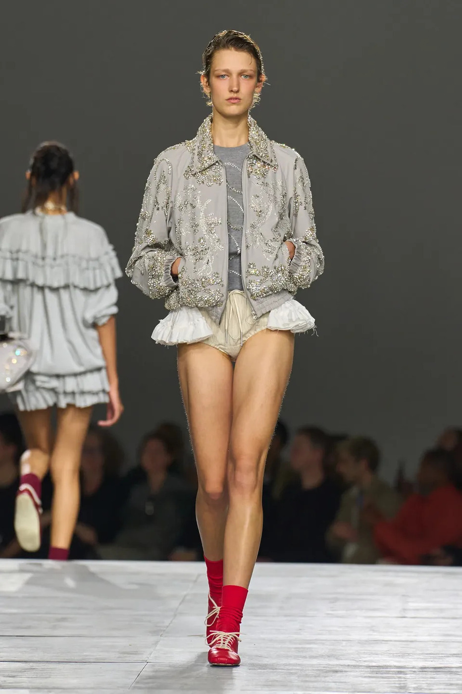 런웨이에서도 꾸준히 몸집을 키워왔습니다. 드리스 반 노튼은 2026 봄/여름 컬렉션에서 봄버 재킷에 레이스 쇼츠를 매치해 의외로 단단한 스타일링을 완성했습니다. 부드러운 레이스와 스포티한 재킷의 대비가 꽤 신선했죠. 여기에 레드 스니커즈로 포인트를 주니 경쾌한 분위기가 배가됩니다.