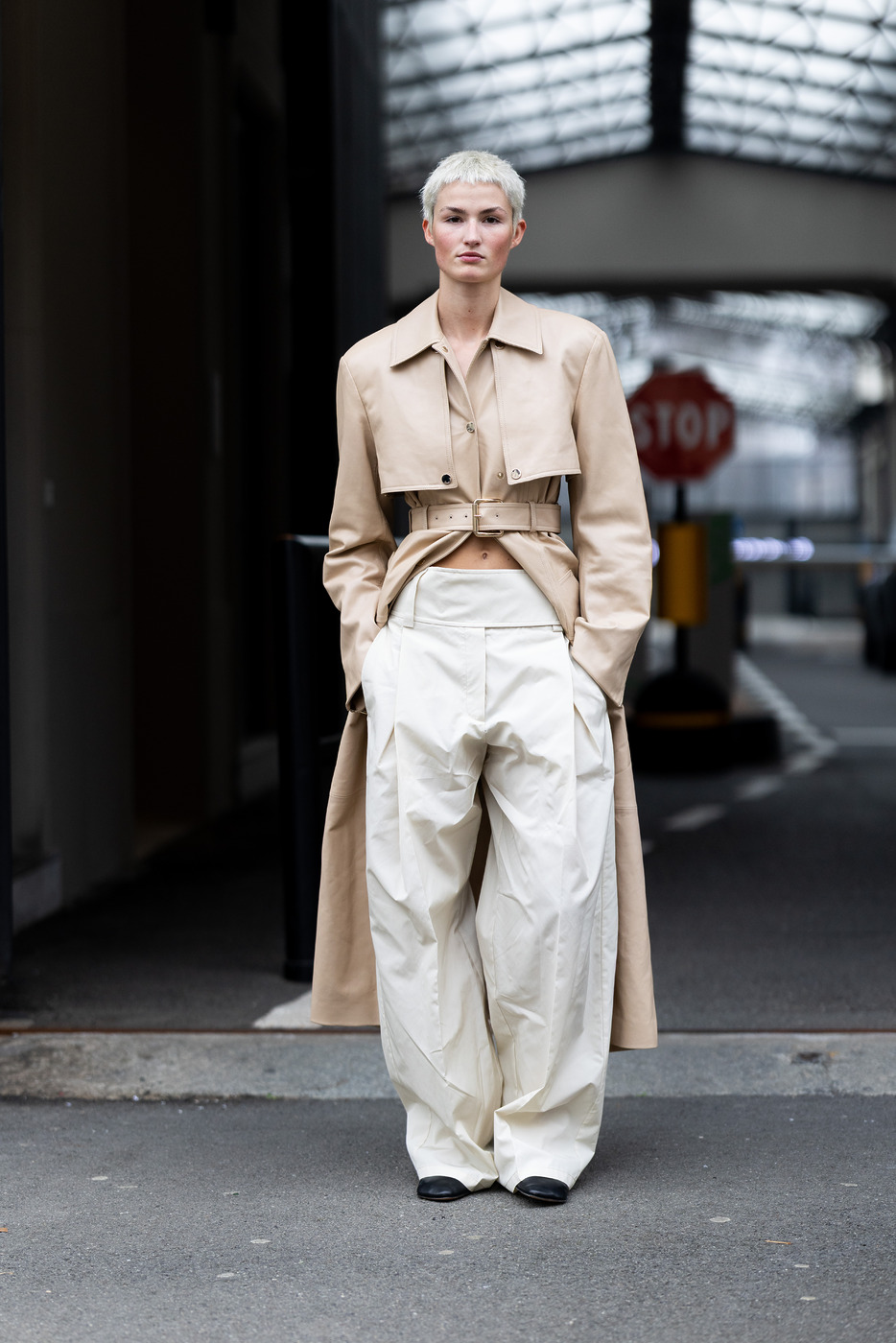 스트리트에서도 그 흐름은 이어졌습니다. 비토리아 체레티처럼 매끈한 블랙 레더 롱 코트를 수트 셋업과 입거나, 브라운 레더 트렌치 코트를 화이트 티셔츠, 데님 미니스커트와 캐주얼하게 매치하거나. 때로는 버튼을 잠그고 벨트를 조여 코트 안에 무엇을 매치했는지는 중요하지 않을 정도로 힘 있는 모습도 연출했죠. 이렇게 레더 트렌치 코트는 생각보다 빨리, 훨씬 일상적인 아이템이 돼가는 중입니다.