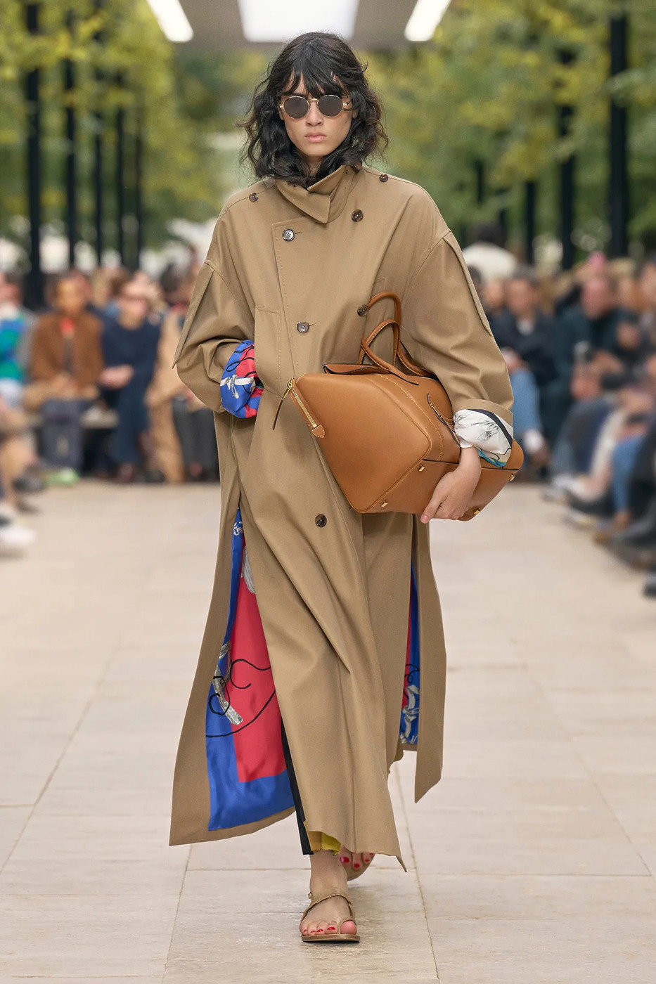 레더 트렌치 코트가 한 축이라면, 반대편엔 전혀 다른 무드가 있었어요. 셀린느, 끌로에, 스텔라 맥카트니, 스포트막스가 보여준 롱 트렌치 코트에는 한 가지 공통점이 있었는데요. 베이지, 크림, 아이보리 톤의 하늘거리는 소재로 만든 코트들은 입는다기보다 ‘두르는’ 느낌에 가까웠죠. 유려하게 흘러내리는 길이, 바람에 살짝 날릴 듯한 가벼움. 그런데 거기서 끝나지 않았어요. 스텔라 맥카트니의 파워 숄더와 스포트막스의 구조적인 어깨 라인처럼 이 코트들은 여성스러움 안에 단단한 뼈대를 품고 있거든요. 부드럽게 보이지만 절대 흐물거리지 않습니다.