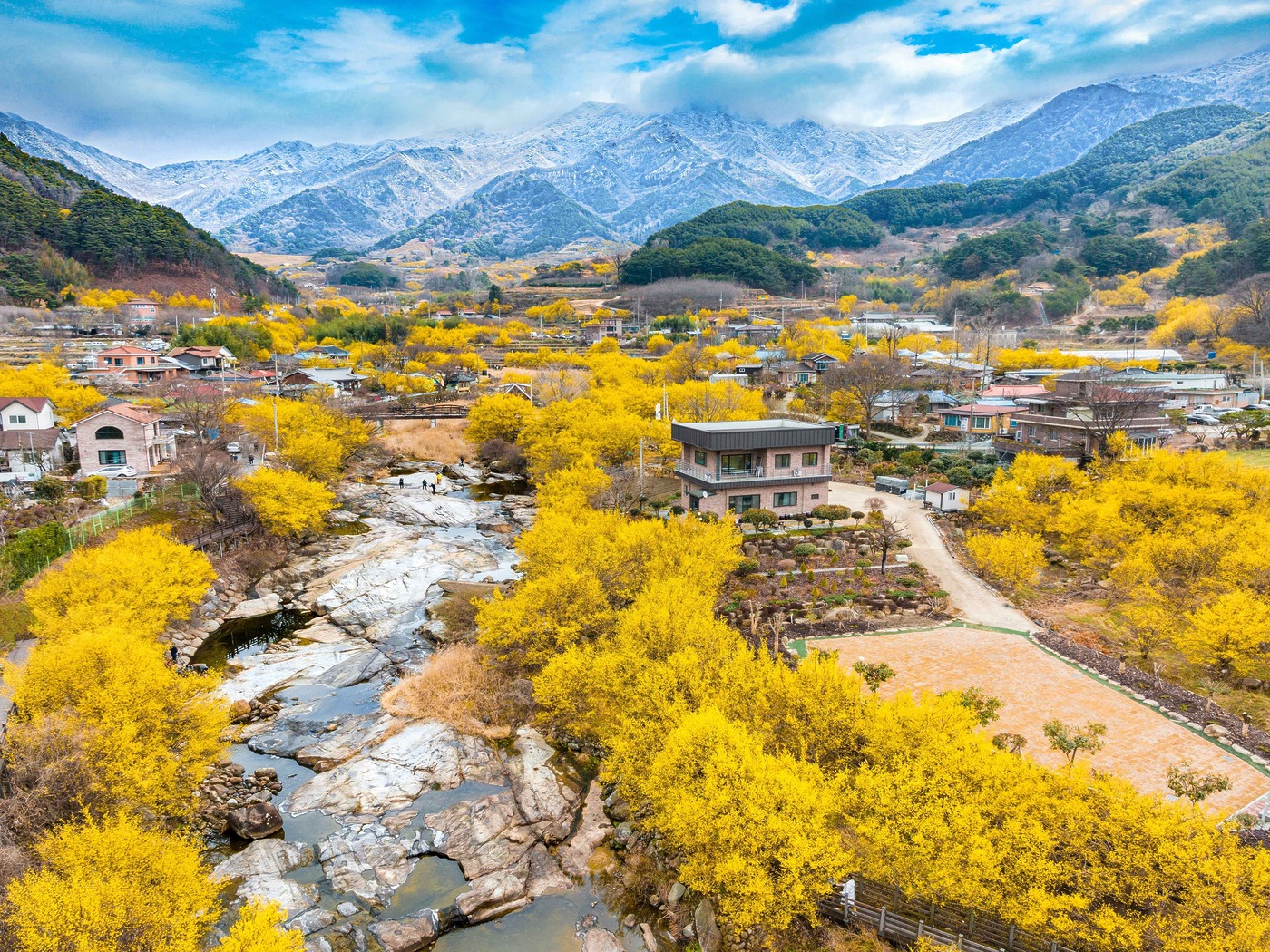 노란 꽃이 가장 먼저 봄을 알리는 곳. 지리산 자락에 자리한 산동면 일대는 산수유꽃이 피는 3월 중순이면 마을 전체가 황금빛으로 변한다. 오래된 돌담과 기와지붕 사이로 번지는 노란 물결은 한 장의 수채화를 닮았다. 꽃길을 따라 걷다 보면 인근 섬진강 변의 벚꽃 길과 자연스럽게 이어진다. 두 가지 꽃을 하루 안에 볼 수 있는 드문 여정이다.