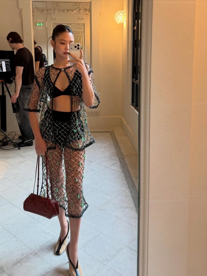 우선 제니는 바다색 비즈가 들어간 네트 투피스를 입었습니다. 짜임이 꽤 커서 이너로 입은 브라 톱과 쇼츠가 그대로 드러나는 과감한 의상이죠. 시선이 이미 옷으로 충분히 모이는 상황이라면 뷰티는 한발 물러서는 편이 훨씬 세련됩니다.