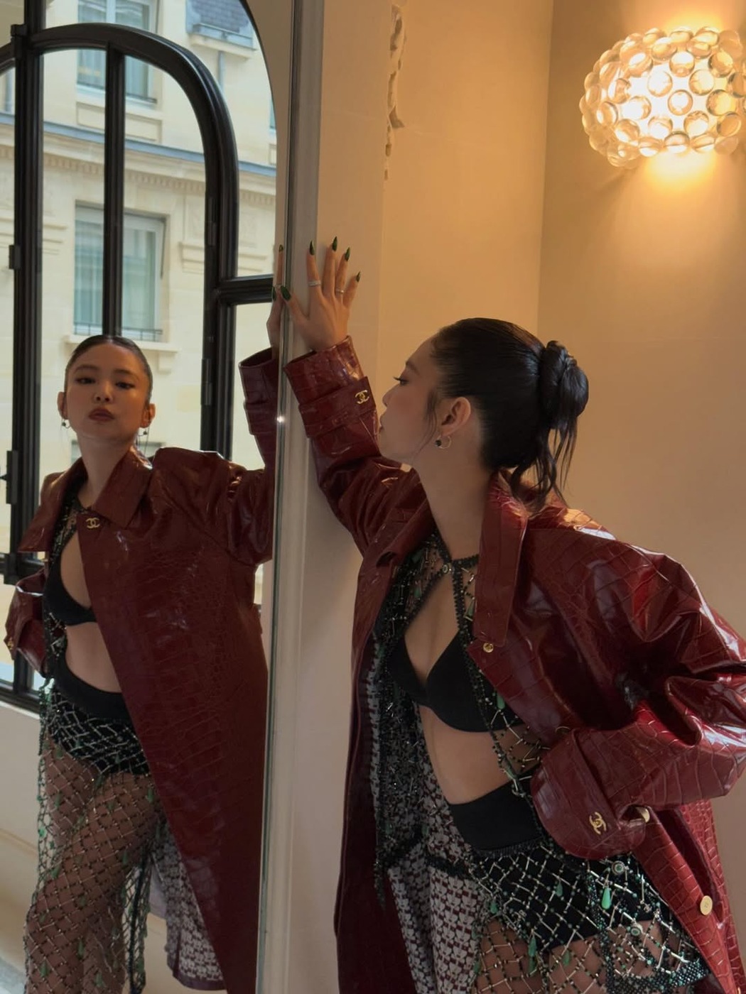 컬러 조합도 흥미롭습니다. 바다색과 닮은 청록색은 빨간색과 보색 관계인데요. 제니는 이 원리를 그대로 활용했습니다. 레더 코트와 백에 붉은 톤을 얹어 컬러 대비를 확실하게 이루었죠. 덕분에 코트를 입거나 가방을 드는 순간 손끝 네일이 자연스럽게 눈에 들어옵니다. 옷과 액세서리 사이에서 색이 서로 밀어주고 끌어주는 구조가 만들어진 셈이죠.