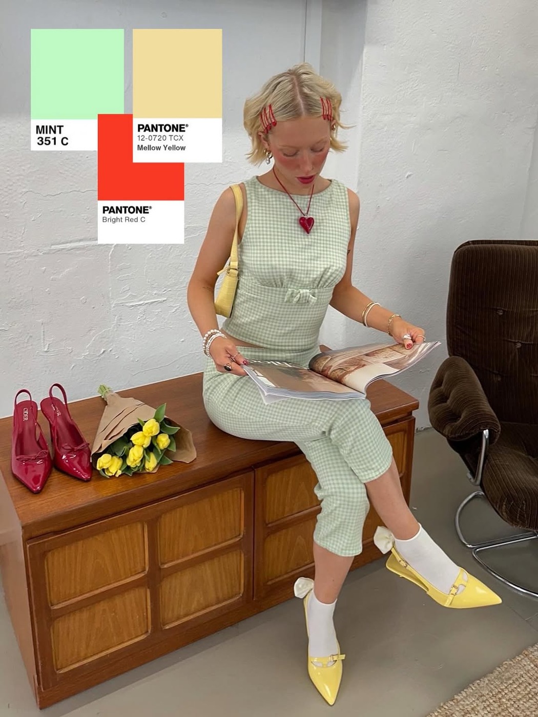 옐로는 채도가 높으면 눈에 확 들어오니 채도를 낮추는 게 좋습니다. 버터처럼 은은한 옐로 블라우스에 러플이나 프릴을 가미하면 분위기가 훨씬 부드러워지죠. 여기에 미니스커트를 매치해보세요. 상의가 부드러운 인상을 주기 때문에 짧은 길이도 도발적으로 보이지 않고 산뜻한 봄 스타일로 정리됩니다.