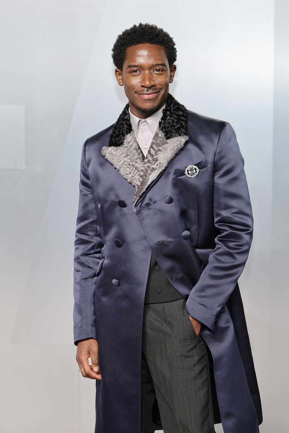 <F1 더 무비>의 댐슨 이드리스는 짧은 아프로 헤어스타일과 부담스럽지 않은 얇은 콧수염을 연출했습니다. 모피 칼라의 프라다 수트와도 잘 어울렸죠.