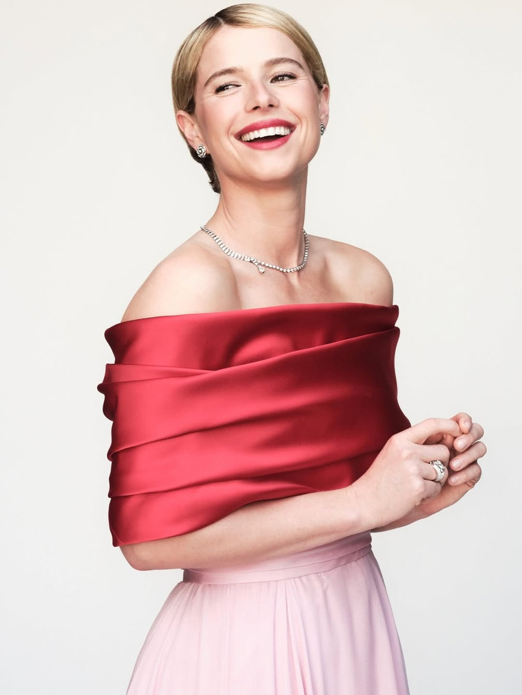 제시 버클리는 선명한 핑크 레드 립을 선택해 얼굴에 조명을 밝힌 듯 화사한 생기를 더했습니다. 립스틱을 입술 전체에 꽉 채운 풀 립 스타일이지만, 입술 라인을 살짝 뭉개 답답함 없이 자연스러운 느낌을 냈죠.