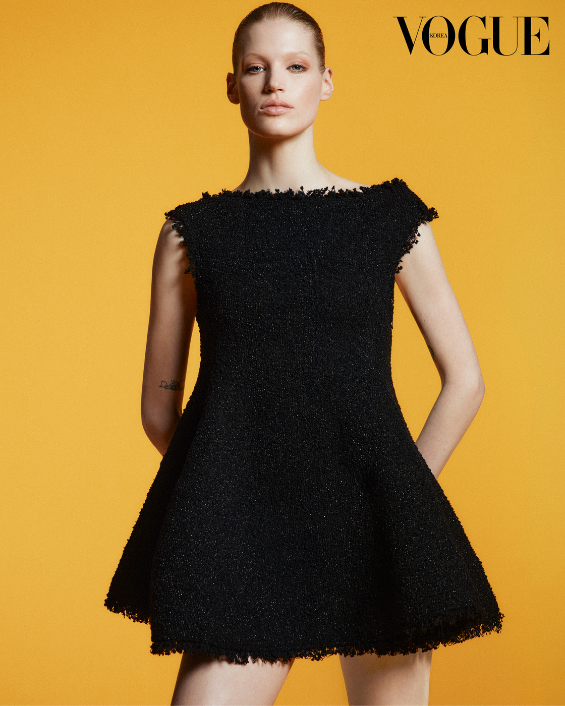 WOMAN IN BLACK “완전히 1960년대군요!” 사진가는 간결한 드레스 차림의 재키를 보고 이렇게 소리쳤다. 파리 외곽 생클루 공원(Parc de Saint-Cloud)에서 공개된 2026 여름 컬렉션의 오프닝을 장식한 검정 트위드 미니 드레스.
