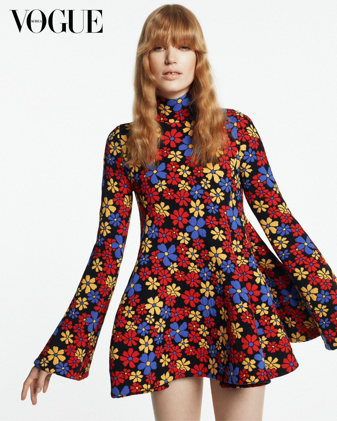 SWINGING SIXTIES 경쾌한 데이지 패턴 미니 드레스가 뿜어내는 강렬한 에너지. 메종이 여성 컬렉션을 확장하며 전환점을 맞은 1960년대를 연상시킨다. 의상과 액세서리는 셀린느(Celine).