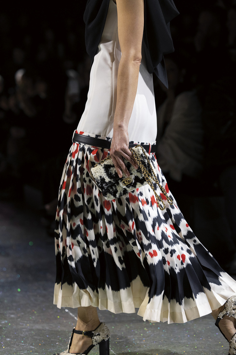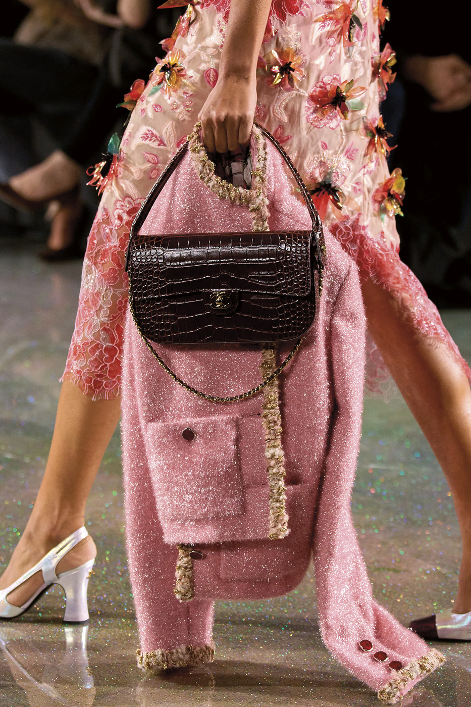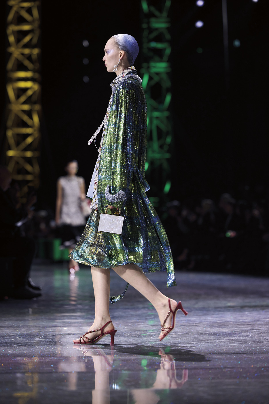 이번 컬렉션을 통해 샤넬 공방이 원단으로 할 수 있는 모든 걸 내보이기도 했다. 진주 스팽글 민소매 톱과 스커트 세트, ‘액션 페인팅’ 기법 스티치가 돋보이는 스커트 수트, 애벌레가 나비로 변태한 듯한 모습으로 연출된 자수로 가득한 루렉스 벨벳 슬립 드레스가 돋보였다. 그랑 팔레의 탁 트인 전경이 인상적이었지만, 이 의상과 그 작품의 정교함을 온전히 담아내기에는 적합하지 않았다. 재킷 밑단을 뒤집어 안감을 확인하거나, 가까이에서 슬립 드레스의 깃털 같은 가벼움을 감상해야 그 진가를 확인할 수 있었을 것이다.