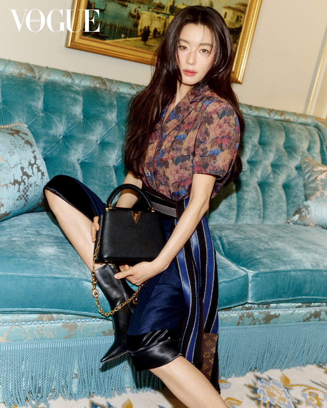 ART DE VIVRE 전지현이 착용한 꼬임 디테일 스웨터와 벌룬 스커트는 니콜라 제스키에르(Nicolas Ghesquière)가 ‘삶의 예술’에 대한 찬미를 그려낸 2026 봄/여름 컬렉션 의상. 집과 같은 개인적인 영역에서 누리는 자유와 그 안에서 경험하는 예술과의 관계에 대한 이야기다. “먼저 자신을 위해 옷을 입는 것입니다. 자기 아파트를 한 바퀴 여행하는 느낌이죠.” 오리엔탈 카펫과 19세기 프렌치 자수에서 영감을 받은 태피스트리 운동화 ‘LV 스니커리나’를 신고서 말이다.
