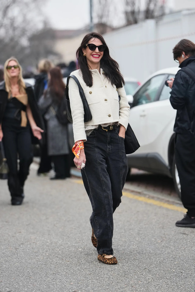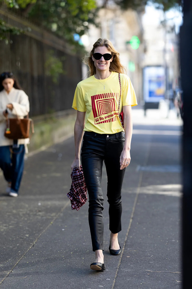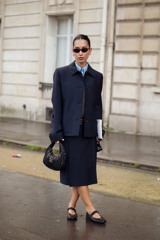 스커트와 만날 때는 더 분명해집니다. 미디스커트 아래 블랙 발레 플랫을 더하면, 종아리부터 발끝까지 선이 끊이지 않고 자연스럽게 이어지면서 전체 실루엣이 한층 정돈되고 길어 보입니다. 힐처럼 긴장감을 주지 않는데도 단정해 보이는 이유는 발등이 드러나면서 답답함이 사라지기 때문입니다. 그뿐인가요. 레더 팬츠처럼 존재감이 강한 아이템에도 균형을 맞춰줍니다. 발레 플랫의 부드러운 면이 강한 질감을 은근히 눌러주는 역할을 하는 거죠. 이때 앞코가 너무 둥글기보다는 살짝 각이 잡힌 디자인을 고르면 훨씬 세련된 인상을 줍니다.