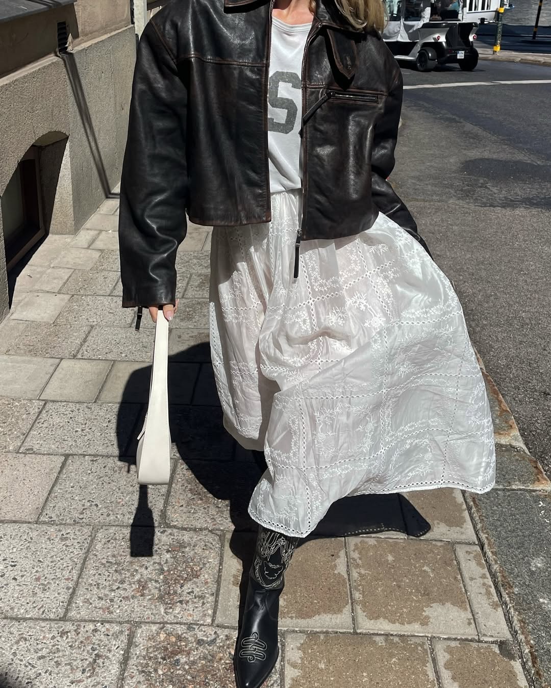 뮤직 페스티벌에 가거나 오랜만에 친구들과 저녁 식사를 함께 하는 특별한 날에는 엘사 호스크의 룩을 참고하세요. 흰색 맥시스커트는 카우보이 부츠, 가죽 재킷과도 환상적인 조화를 이루니까요.