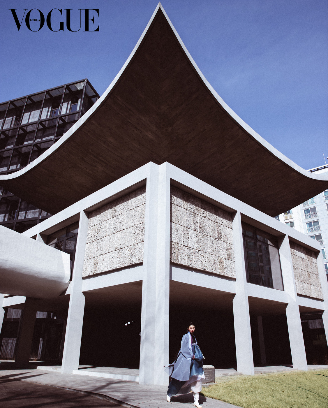 1961년 준공된 주한 프랑스 대사관. 한국 현대건축의 선구자인 건축가 김중업의 대표작이자 한국 근대건축의 걸작으로 손꼽히는 업무동이다. 처마 선으로 대표되는 한국 전통 건축의 형태미가 도시의 빌딩 숲에서 존재감을 드러낸다. 두루마기 세 벌과 저고리, 치마는 금의재(Geumuijae), 속바지는 김혜순 한복(Kimhyesoon Hanbok), 노리개는 금단제(Kumdanje), 당혜는 이규옥 한복(Leekyuok Hanbok).