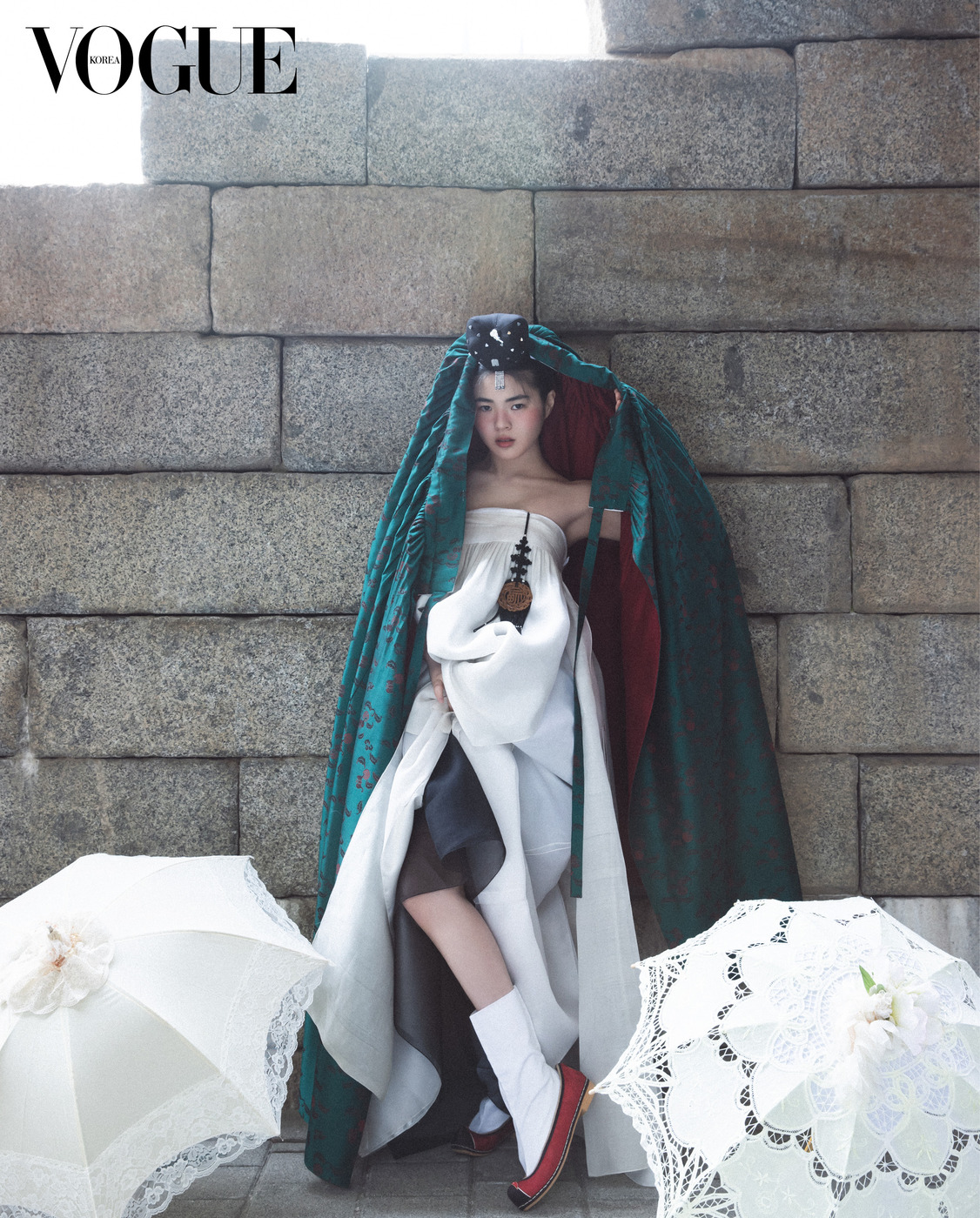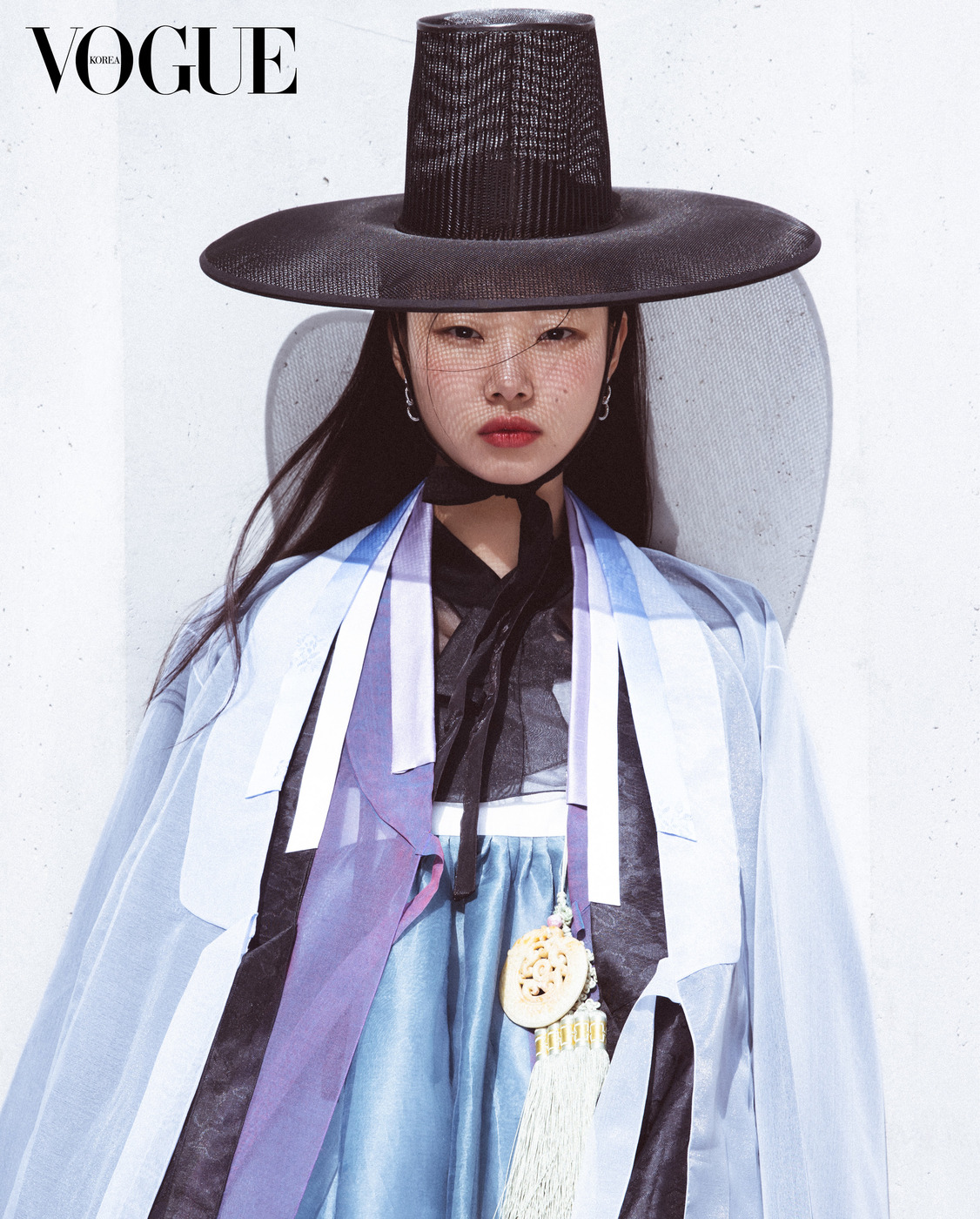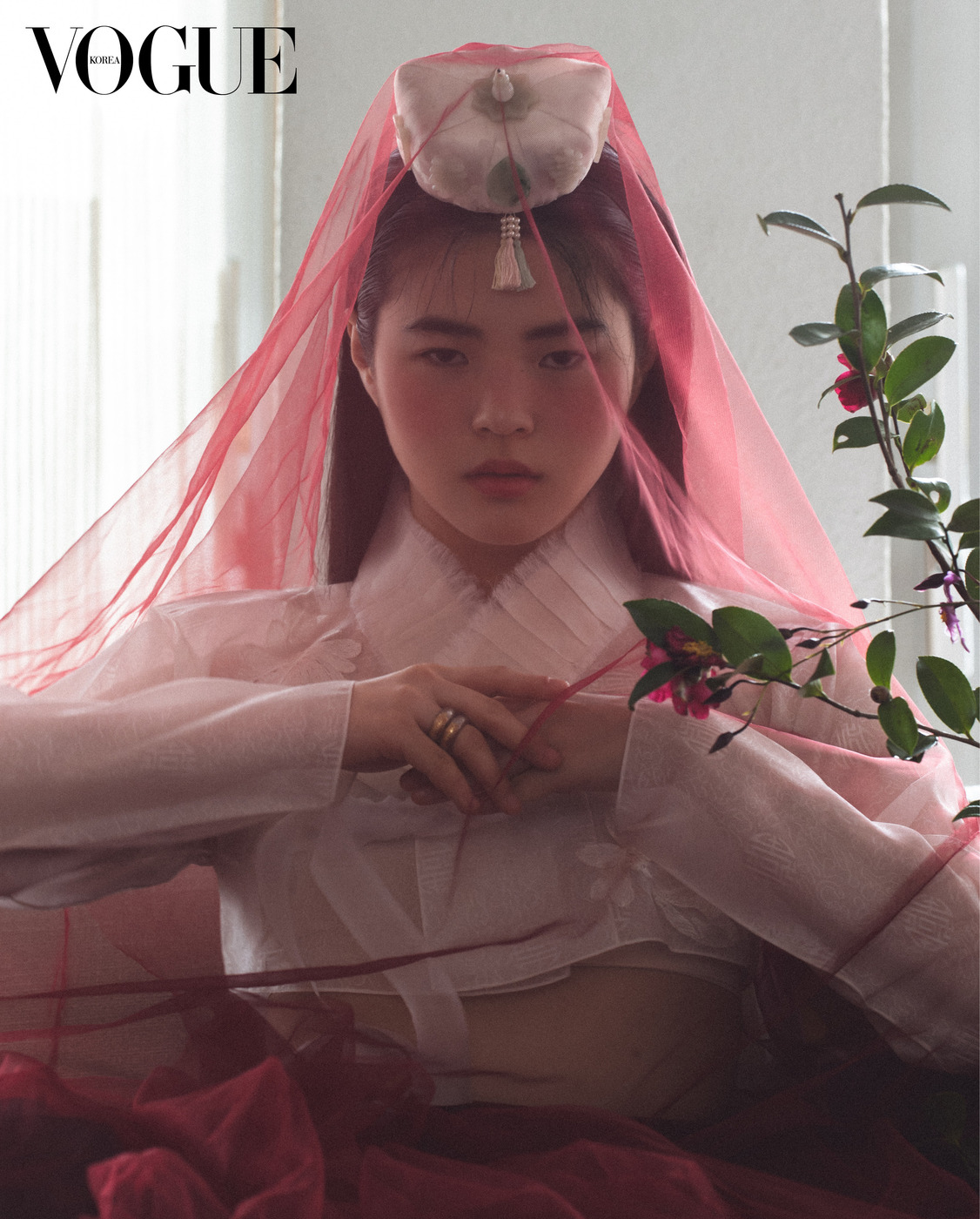 투명한 흰색 저고리와 하늘하늘한 진회색 치마는 한국의상 백옥수(Baek Oak Soo), 함께 스타일링한 붉은색 치마는 줄리앙 포니에(Julien Fournié Haute Couture), 족두리는 차이 김영진(Tchai Kimyoungjin), 오른손 반지는 이규옥 한복(Leekyuok Hanbok), 버선은 금단제(Kumdanje).