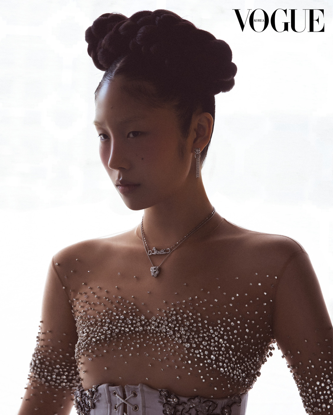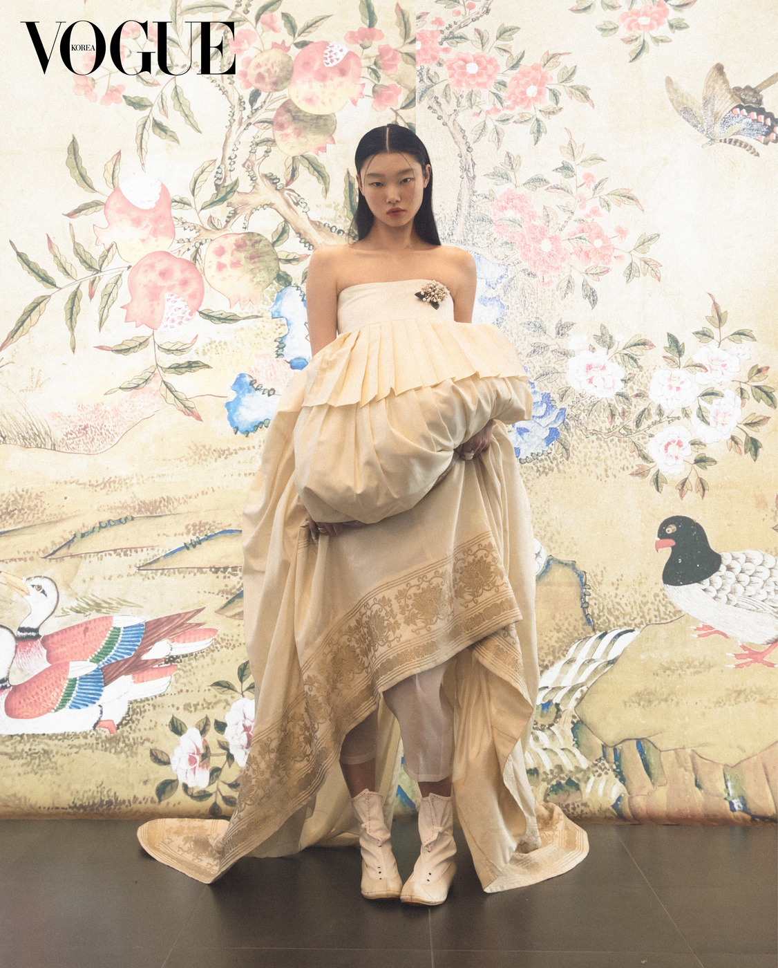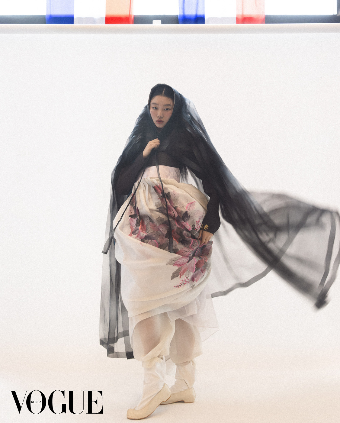 투명한 흰색 저고리와 하늘하늘한 진회색 치마는 한국의상 백옥수(Baek Oak Soo), 함께 스타일링한 붉은색 치마는 줄리앙 포니에(Julien Fournié Haute Couture), 족두리는 차이 김영진(Tchai Kimyoungjin), 오른손 반지는 이규옥 한복(Leekyuok Hanbok), 버선은 금단제(Kumdanje).