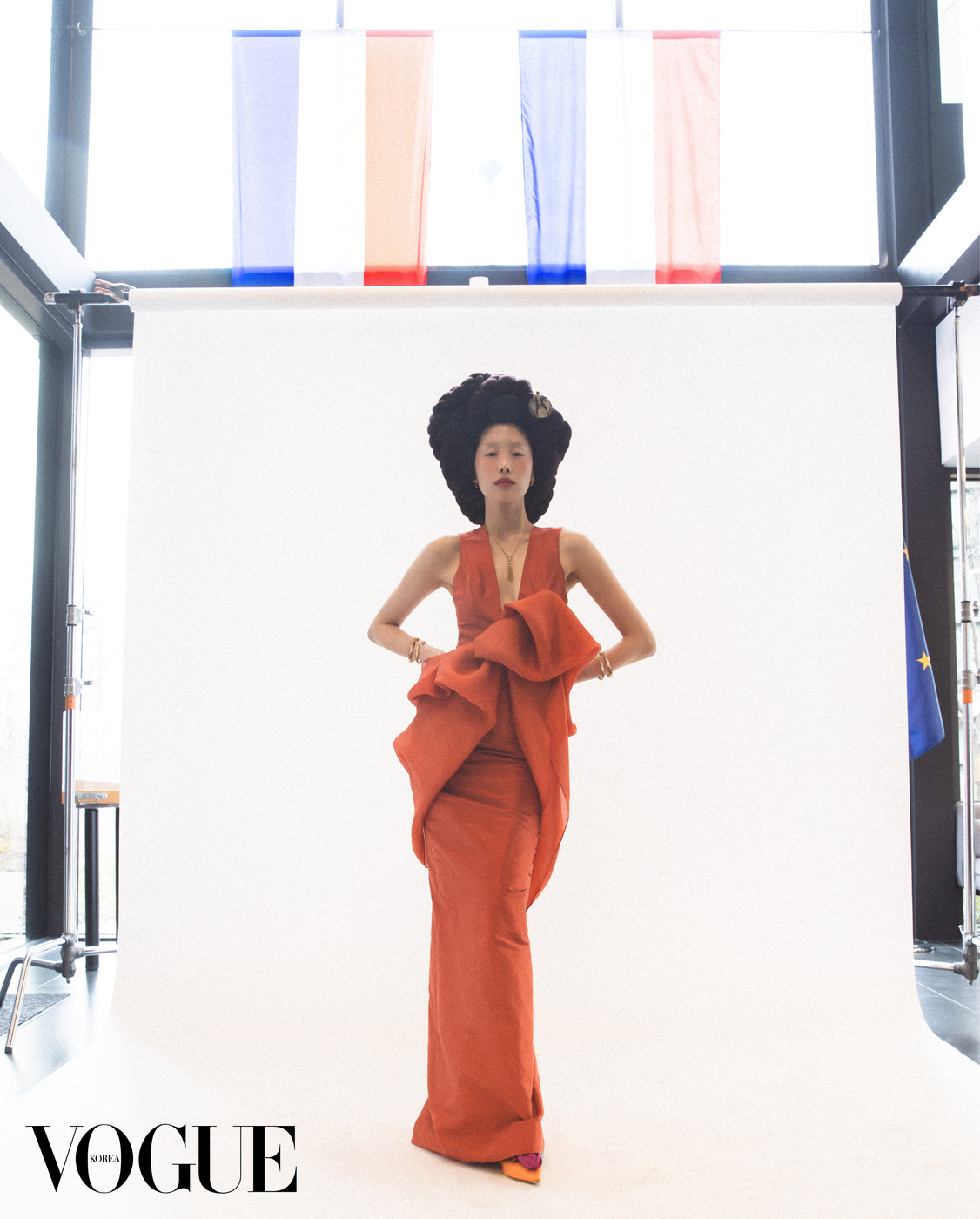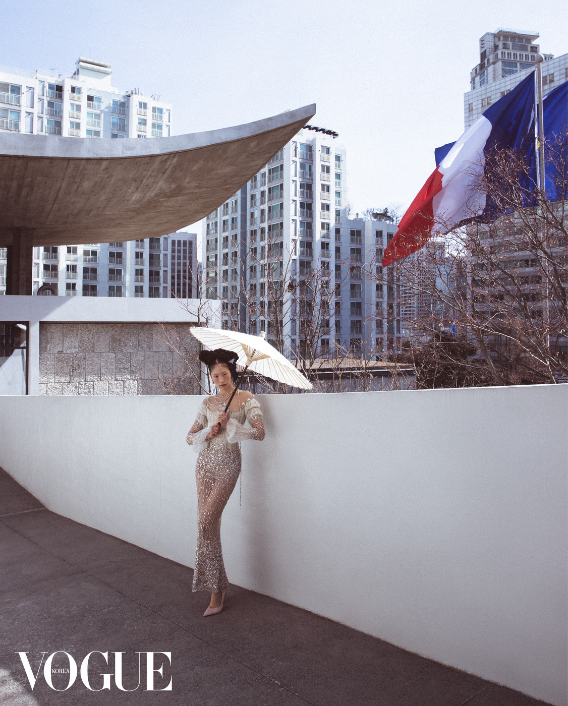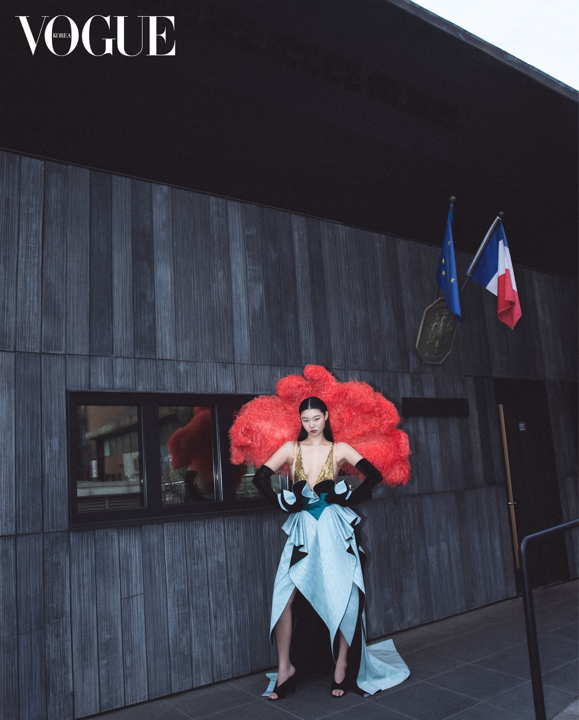 대사관 업무동은 한국·프랑스 수교 140주년 행사 준비가 한창이다. 프랑스 국기 ‘드라포 트리콜로르(Drapeau Tricolore)’ 앞에서 포즈를 취한 모델의 머리에는 한국적인 가체를 얹었다. 볼드한 러플이 달린 드레스는 이마네 아이시(Imane Ayissi), 가체에 장식한 브로치는 한국의상 백옥수(Baek Oak Soo), 빨강을 입힌 아게이트 장식 핑크 골드 귀고리, 차보라이트 가닛, 오닉스, 블랙 래커 장식의 옐로 골드 목걸이, 뱅글은 까르띠에(Cartier), 장미 코르사주 장식 실크 플랫 슈즈는 로저 비비에(Roger Vivier).