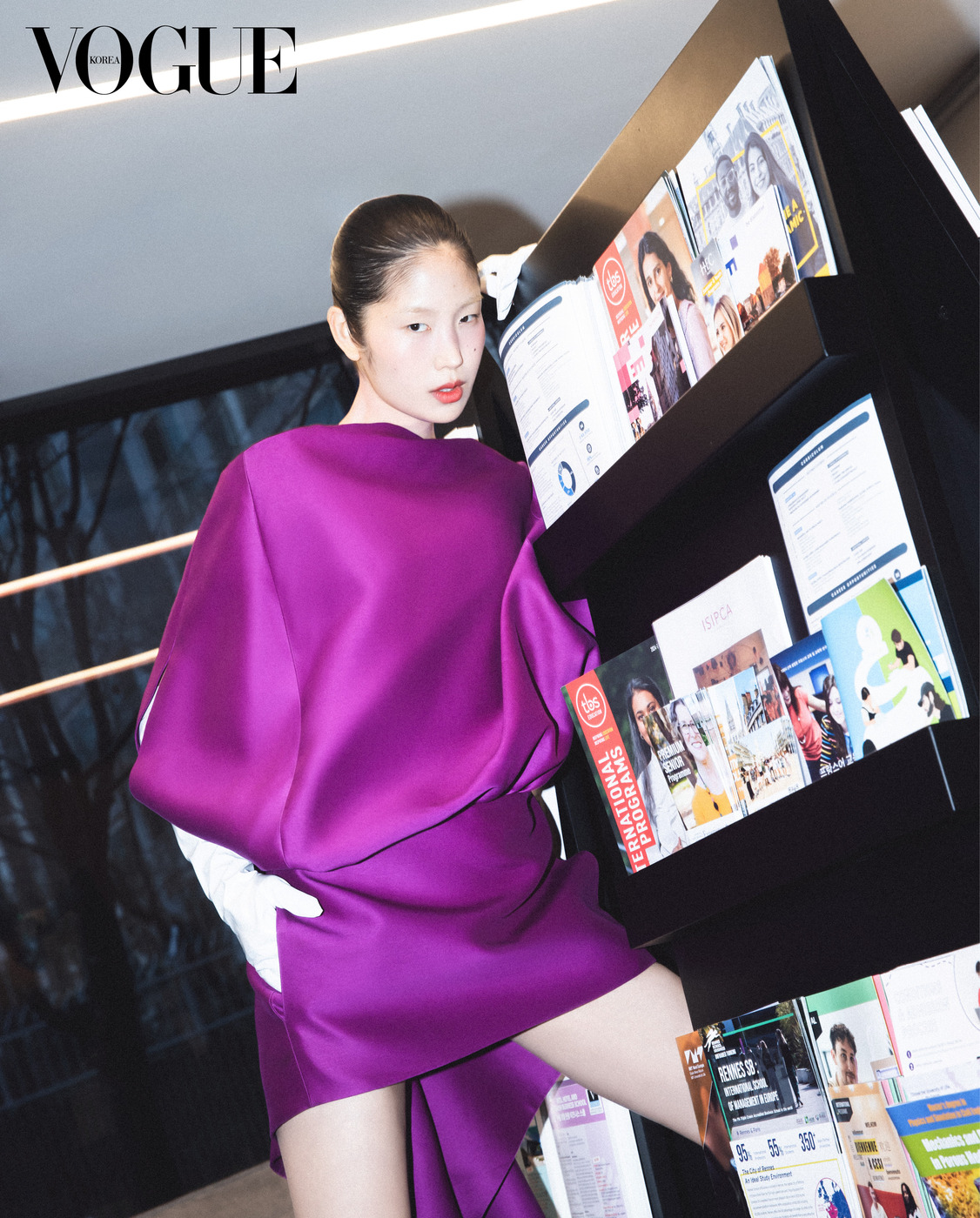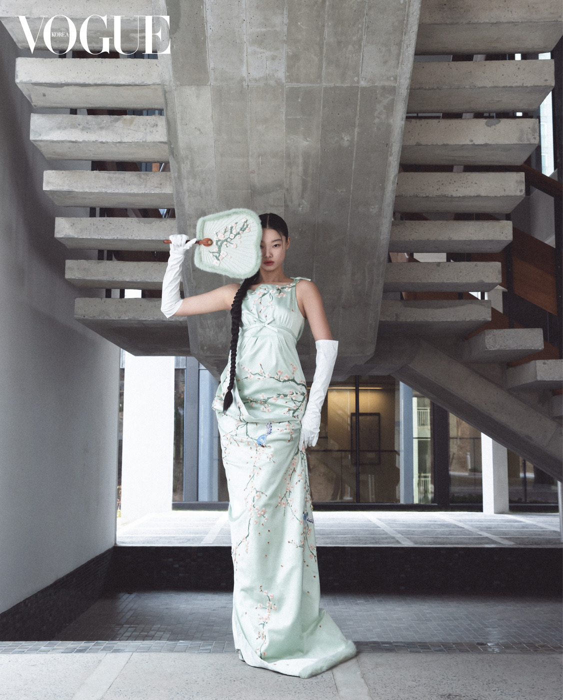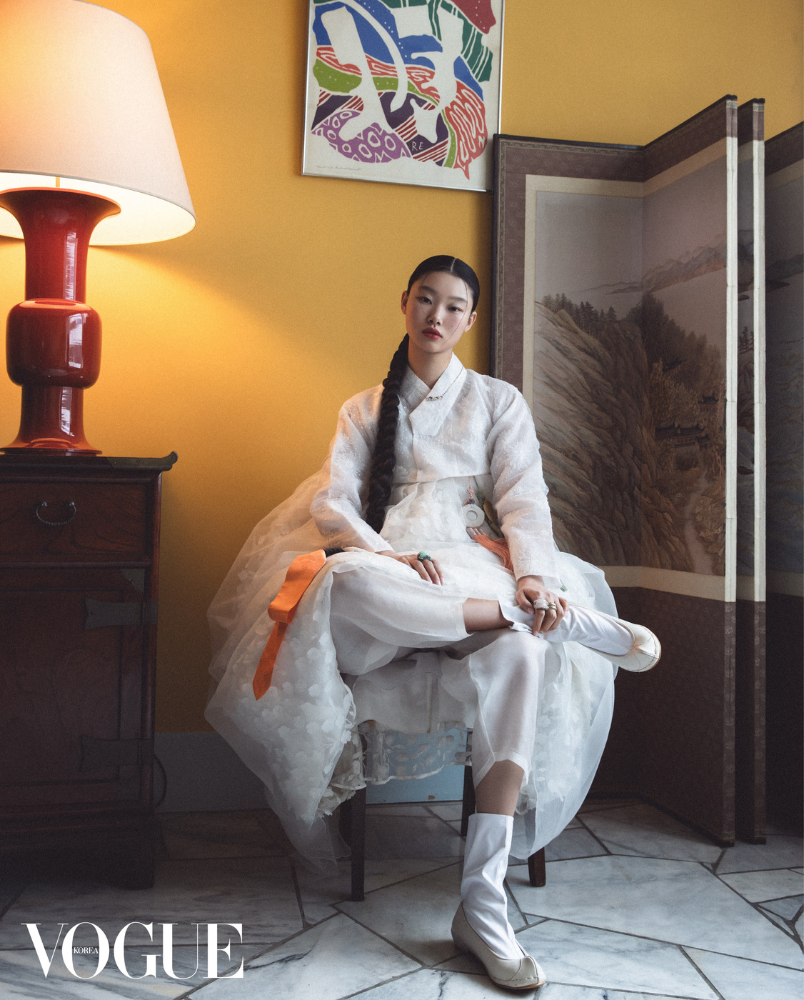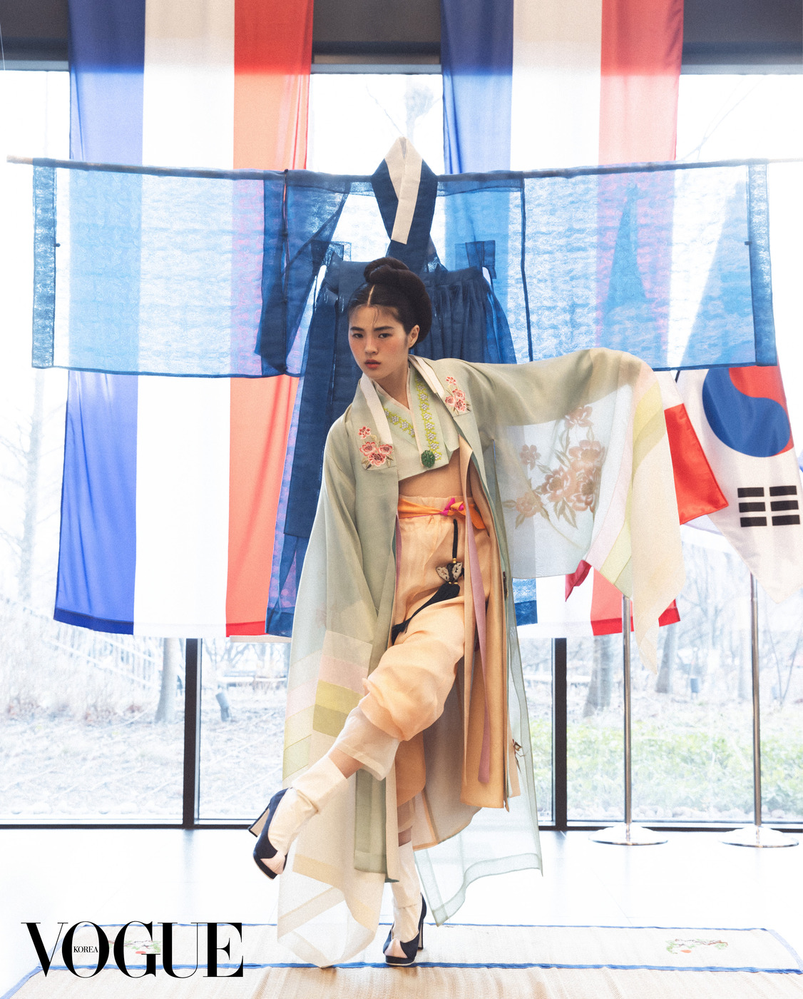 김중업이 설계한 대사관 처마 밑에서 포즈를 취했다. 시퀸 장식 저고리와 꽃 자수 치마는 김혜순 한복(Kimhyesoon Hanbok), 왼손 반지는 이규옥 한복(Leekyuok Hanbok), 버선은 금단제(Kumdanje). 병풍은 국가무형유산 전승공예가 고가민의 수산평안방 8폭 책가도.