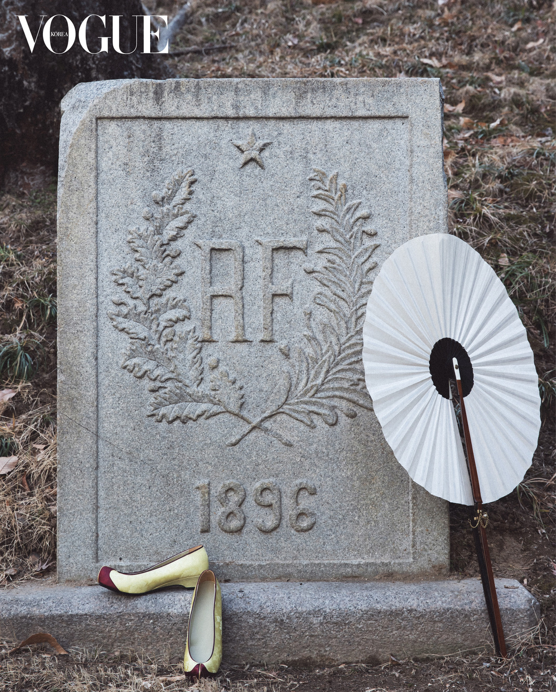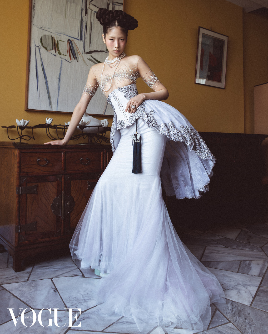 대사관저의 이국적인 노란 벽, 한국적인 병풍과 고가구를 배경으로 고운 흰색 저고리와 치마가 단아하다. 저고리와 치마, 버선, 분홍 노리개와 초록 노리개는 금단제(Kumdanje), 속바지와 댕기는 김혜순 한복(Kimhyesoon Hanbok), 앉아 있는 팬더 형상의 화이트 골드 목걸이는 까르띠에(Cartier). 오른손과 왼손 반지, 당혜는 이규옥 한복(Leekyuok Hanbok).