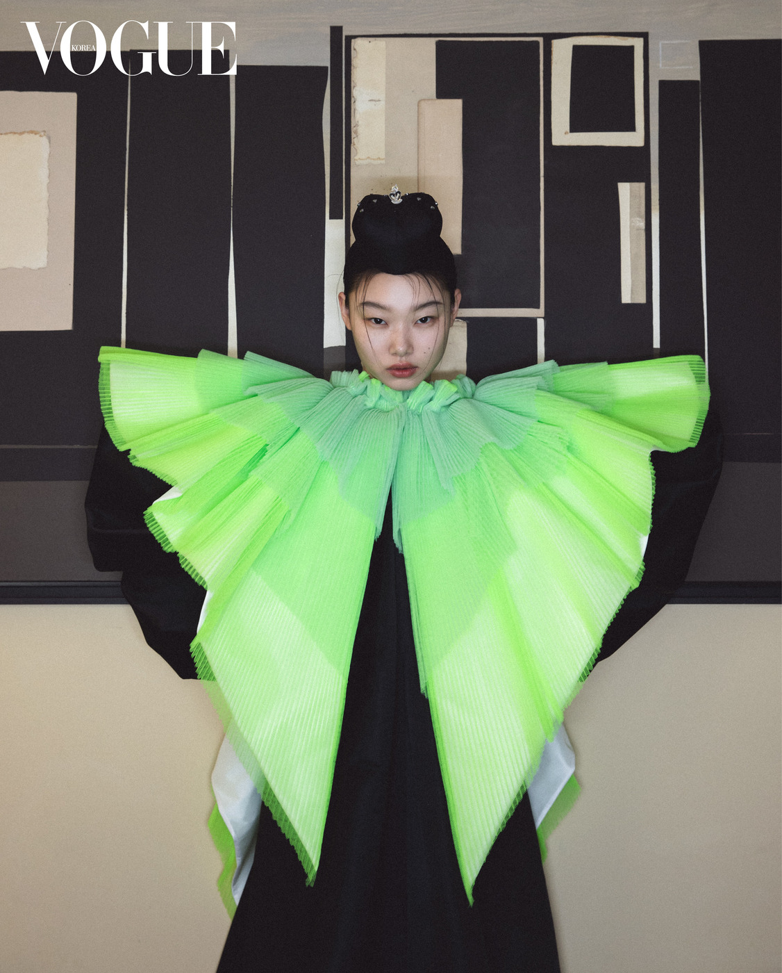 칠흑같이 어두운 검정 퍼프 드레스에 눈이 시릴 만큼 선명한 튤 플리츠 칼라 장식은 빅터앤롤프(Viktor&Rolf), 족두리는 큐 밀리너리(Q Millinery).