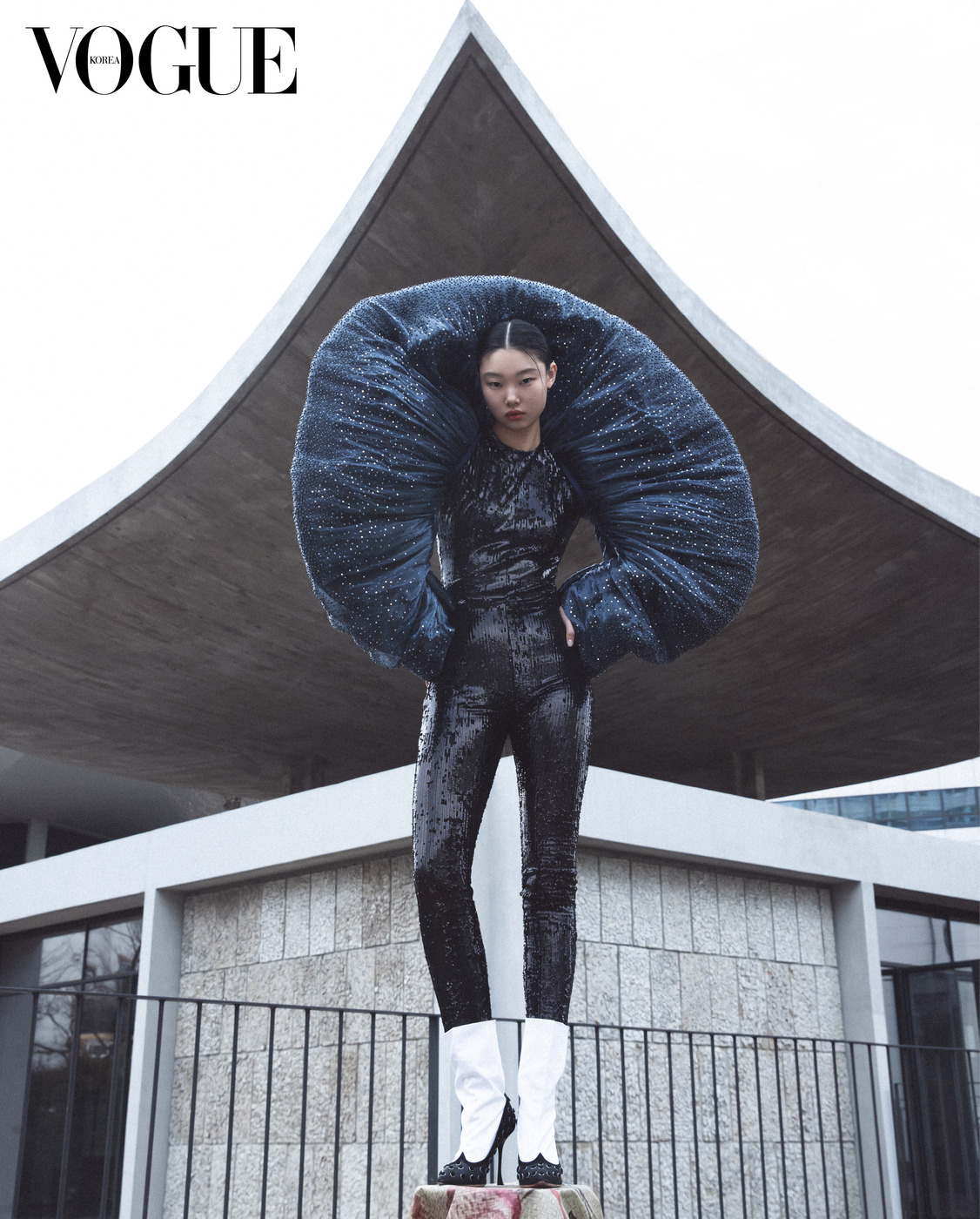 한국의 처마를 차용한 지붕이 서울 도심에서 위풍당당한 분위기를 풍긴다. 비즈 장식 시스루 드레스는 조르주 호베이카(Georges Hobeika Couture), 머리에 장식한 검정 댕기는 금단제(Kumdanje), 귀고리는 파나쉬 차선영(Panache Chasunyoung), 펌프스는 이마네 아이시(Imane Ayissi).