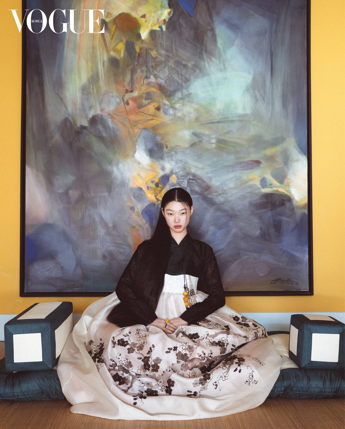 추상화와 보료가 어울리니 이토록 모던하다. 검정 저고리와 수묵화가 그려진 치마는 한국의상 백옥수(Baek Oak Soo), 오른손 중지의 오닉스·다이아몬드 장식 핑크 골드 반지는 까르띠에(Cartier), 노리개와 검지 반지는 이규옥 한복(Leekyuok Hanbok).