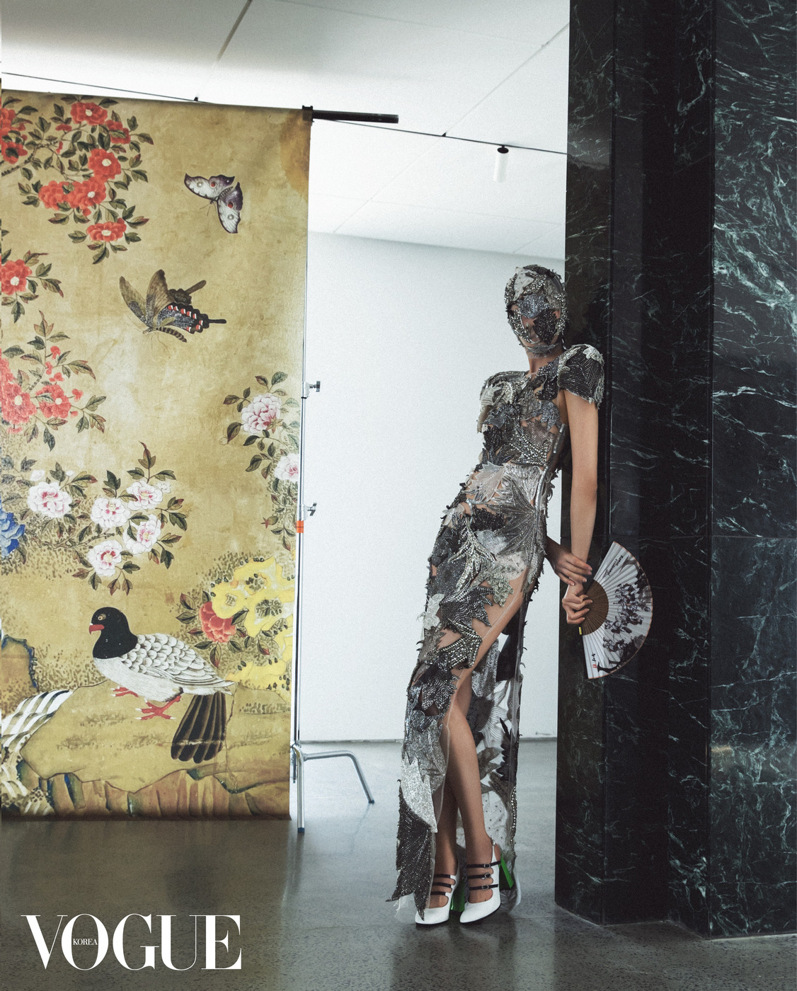 그로테스크한 패치워크 드레스가 민화와 어울려 색다른 아름다움을 뽐낸다. 드레스와 얼굴 마스크, 구두는 제르마니에(Germanier).