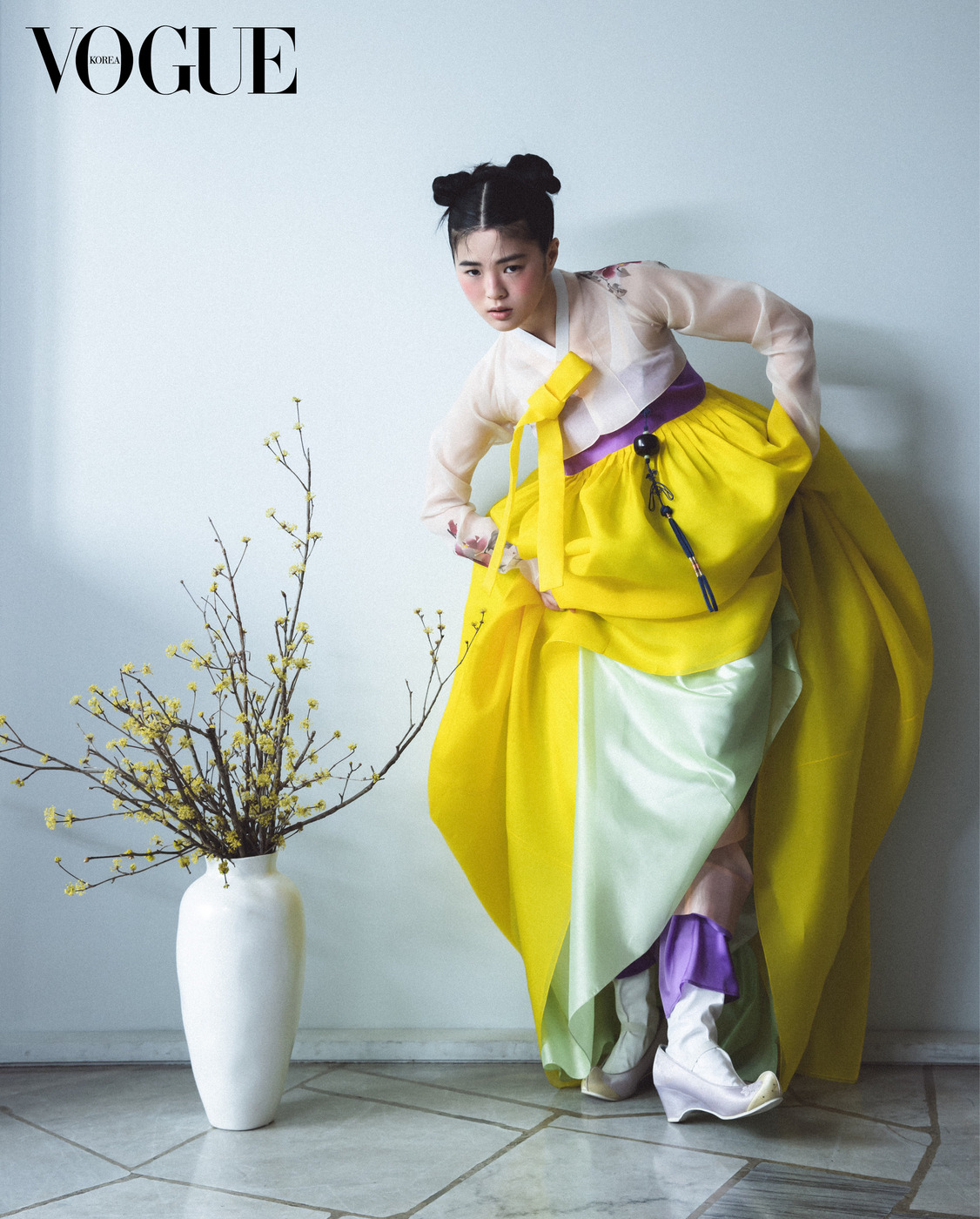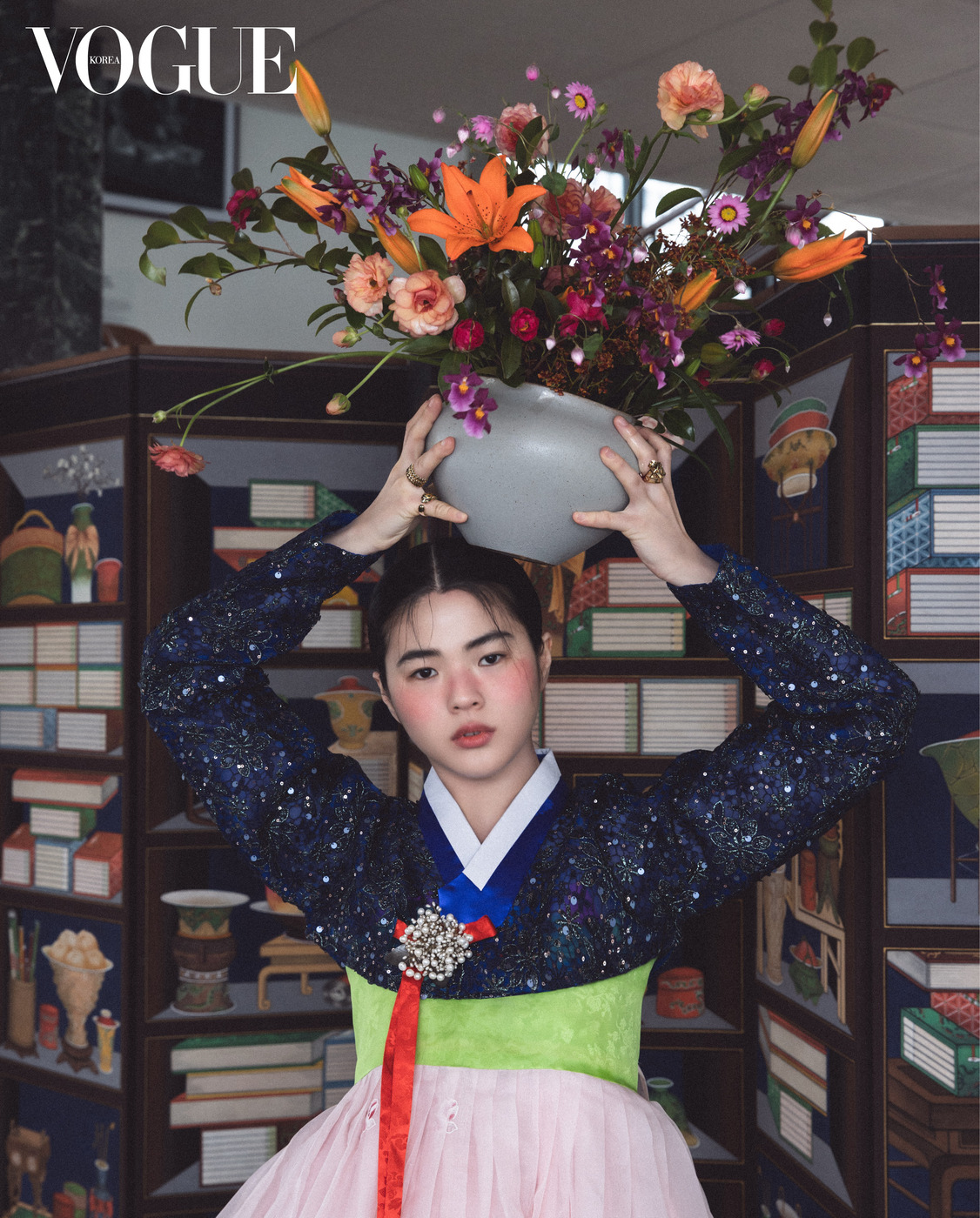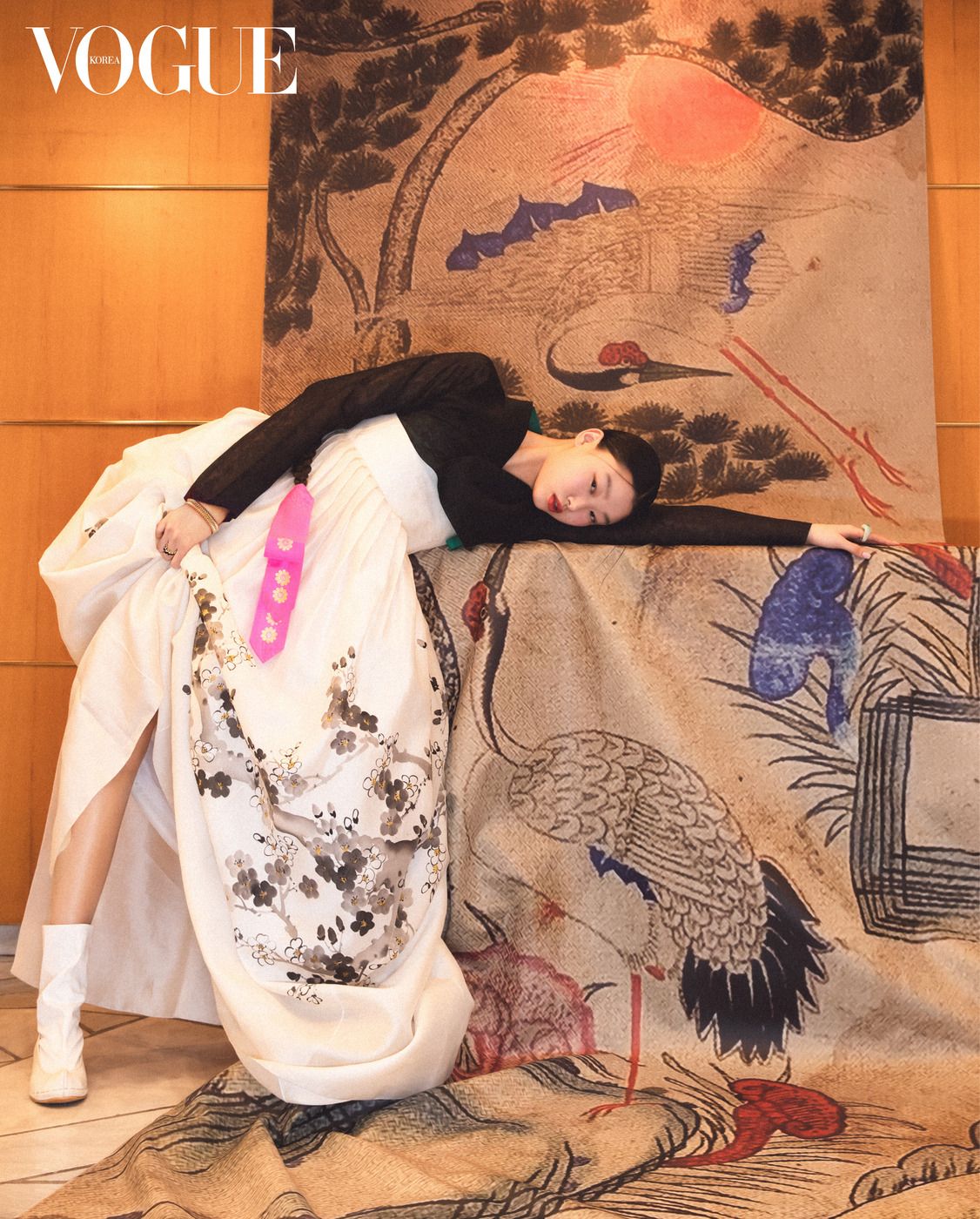 검정 저고리와 수묵화가 그려진 치마는 한국의상 백옥수(Baek Oak Soo), 분홍 댕기는 김혜순 한복(Kimhyesoon Hanbok), 핑크·옐로 골드 뱅글과 오닉스 세팅 반지는 까르띠에(Cartier), 버선은 금단제(Kumdanje), 왼손 반지와 당혜는 이규옥 한복(Leekyuok Hanbok).