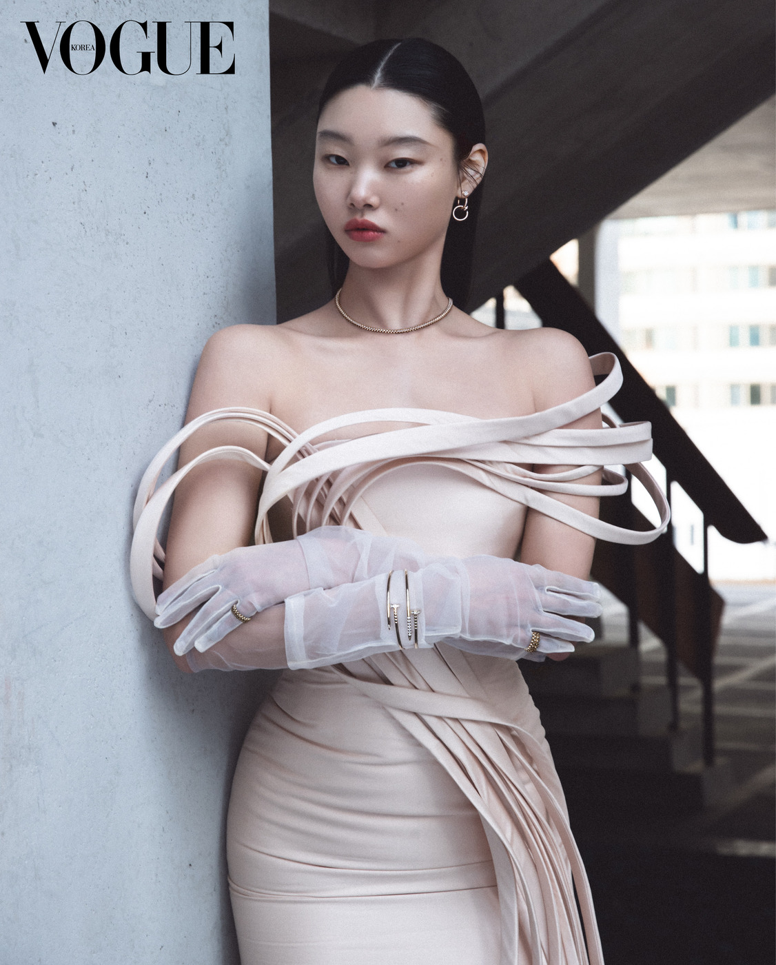 드레스는 라미 알 알리(Rami Al Ali Couture). 핑크 골드 ‘저스트 앵 끌루’ 귀고리, 비즈와 스터드 모티브 ‘클래쉬 드 까르띠에’ 목걸이와 양손 반지, 못 모티브 ‘저스트 앵 끌루’ 옐로·핑크 골드 뱅글은 까르띠에(Cartier).