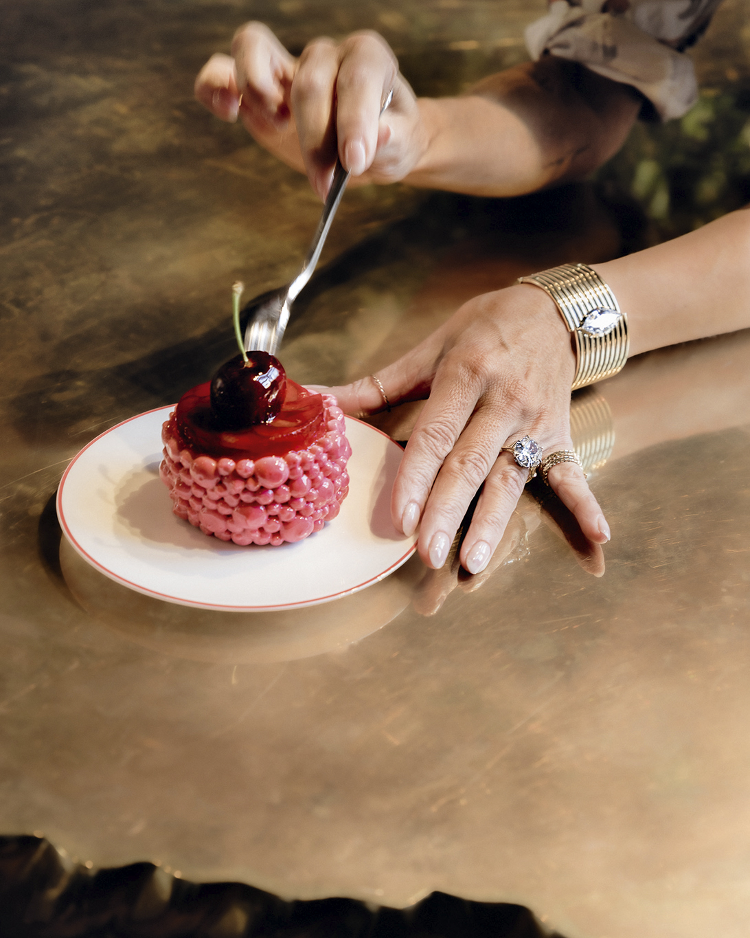 디저트 역시 주얼리 디자이너의 상상력을 자극하는 훌륭한 재료다. 지난해 여름 런던 기반의 제시카 맥코맥(Jessica McCormack)은 사파이어로 뒤덮인 복숭아와 레몬, 배 등 과일 테마 펜던트와 귀고리를 선보였다. 특히 루비를 세팅한 체리 디자인은 너무 매혹적이어서 맥코맥의 메이페어 아틀리에 옆 호텔 더 코노트(The Connaught)의 총괄 페이스트리 셰프 니콜라 루조(Nicolas Rouzaud)가 한정판 체리 타르트를 제작하도록 영감을 주기도 했다. 맥코맥은 현실이 예술을 모방한 이 사례를 두고 “두 창조적 세계의 완벽한 만남”이라고 표현했다.