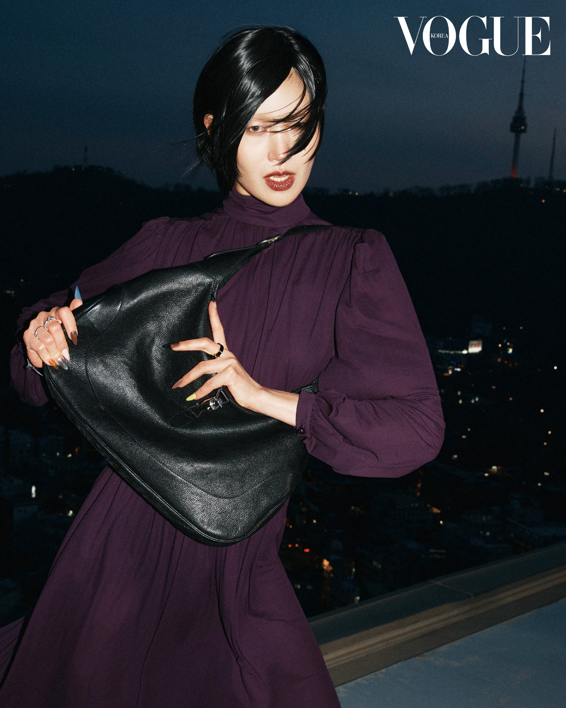 Purple Rain 보랏빛 저지 미디 드레스는 구찌의 부르주아적인 아름다움을 이야기한다. 여기에 구겨진 듯한 소재의 ‘재키 1961’ 핸드백을 더했다. 의상과 액세서리는 구찌(Gucci).