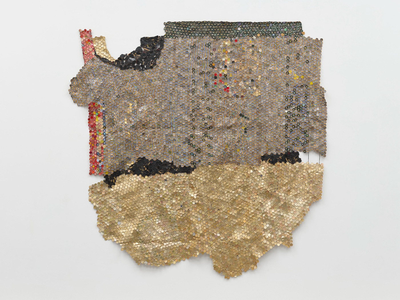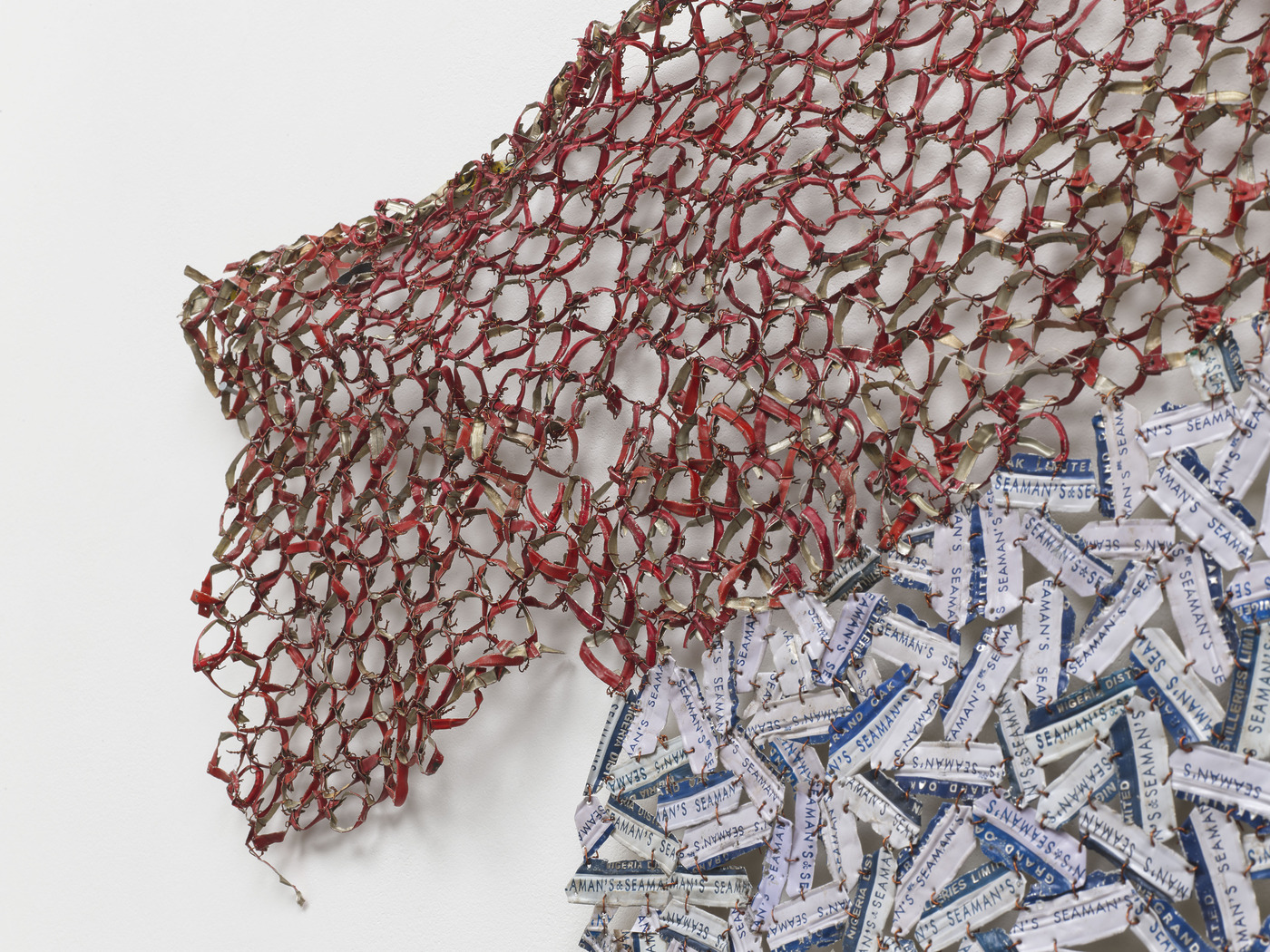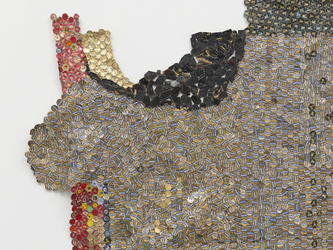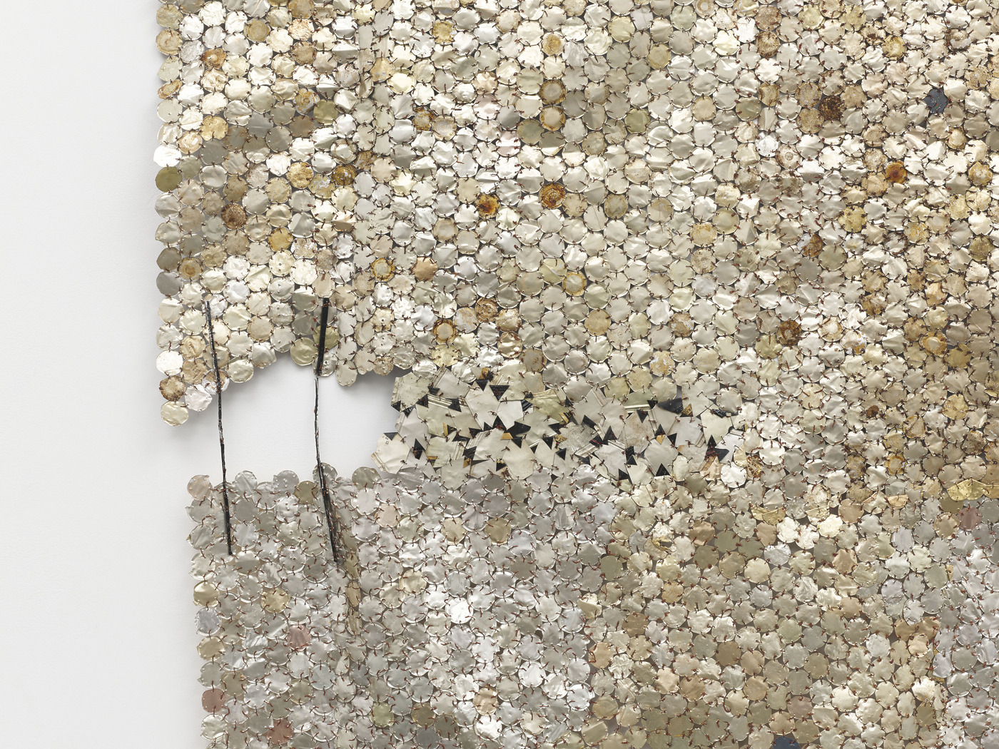 아나추이의 작업은 멀리서 볼 때는 장엄하고, 가까이서 보면 정교합니다. 그때나 지금이나 그의 작품은 설치된 장소와 방향에 따라 시시각각으로 반응하고 변화합니다. 바람이 불면 흔들릴 것 같기도 합니다. 특히 이번 신작은 아나추이의 금속 작업 가운데 최초로 ‘완전한 상호성의 논리에 따라 구상되고 전시되도록 기획’한 작품이라는군요. 조각의 안과 밖, 앞과 뒤 중 더 중요한 면이 없고 심지어 서로 대등하다는 겁니다. 보통 병뚜껑의 안쪽 면은 은은한 은색으로 반짝이고, 바깥쪽 면에는 브랜드가 인쇄되어 있지요. 공간에 놓인 그의 작업은 어느 쪽에서 보더라도 제 형태와 아우라를 발산합니다. 일반적으로 관람객이 보게 되는 앞면과 숨은 뒷면, 중요한 부분과 중요하지 않은 부분으로 나뉘는 게 아니라 조각의 모든 면에 가치를 부여하는 거죠. 더군다나 작은 병뚜껑을 일일이 절단하고, 펴고, 접고, 구리철사로 엮은 그의 작업을 가만히 들여다보면, 이 작업을 가능케 했을 모든 이의 존재까지 떠오릅니다.