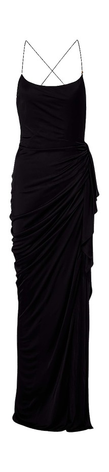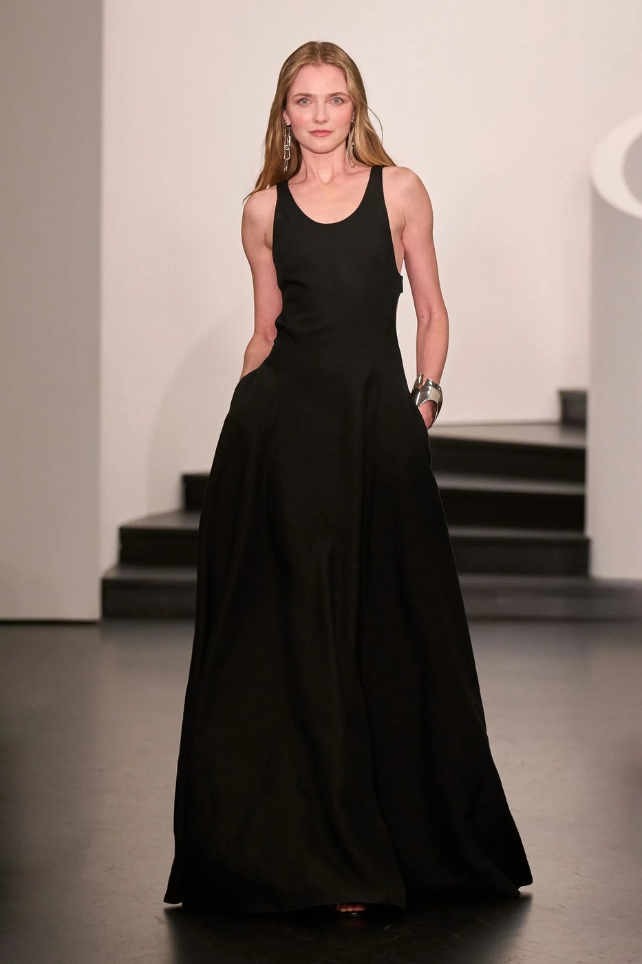 가장 단순하면서도 가장 기본적인 디자인, 검은색 미니멀 롱 원피스입니다. 색이나 장식 같은 기교 없이 심플한 라인을 자랑하죠. 2026 봄/여름 시즌, 검은색 롱 원피스는 과장된 장식 없이 간결한 미학을 보여줍니다. 랄프 로렌 런웨이에서 이를 확인할 수 있죠. 은색 주얼리로 포인트를 주었군요.