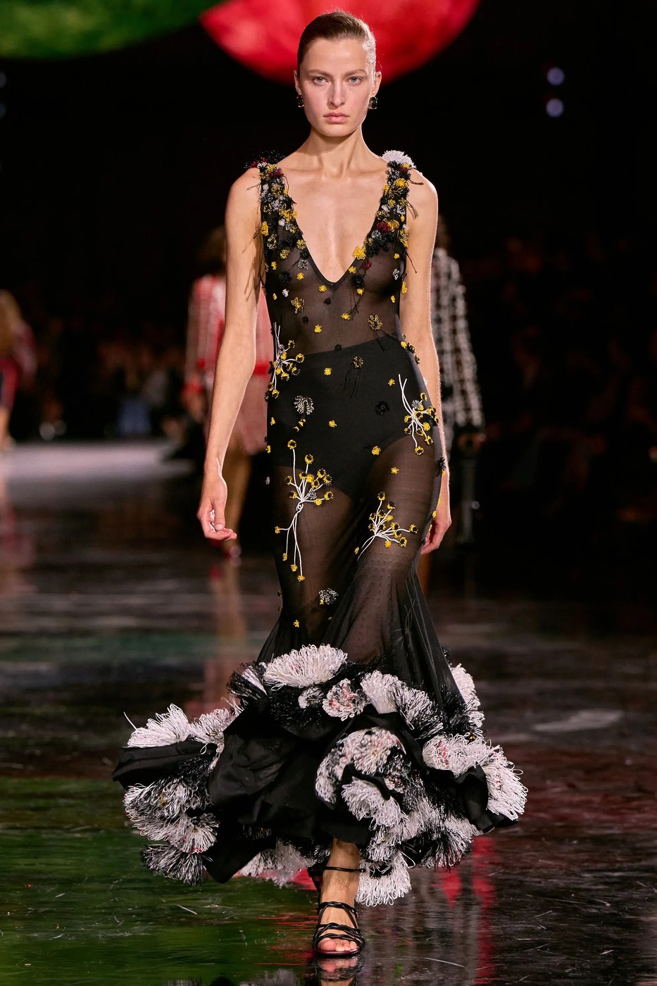 시스루 원피스의 인기는 지난 몇 년간 계속됐습니다. 속옷을 드러내 대담한 느낌을 주거나 레이어링을 통해 자유로운 무드를 강조하는 방식으로 연출했죠. 올여름에도 시스루 원피스 트렌드는 계속됩니다. 마티유 블라지의 샤넬이 대표적이었습니다. 그는 자신의 첫 샤넬 패션쇼에서 하단에 러플 장식을 더하고 다양한 꽃무늬 디테일을 살린 시스루 롱 원피스를 선보였습니다.