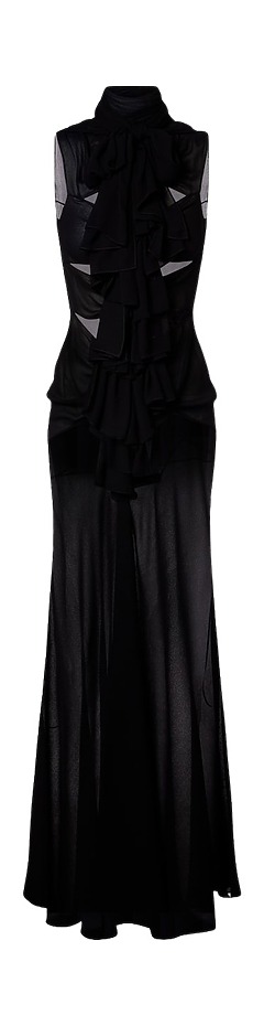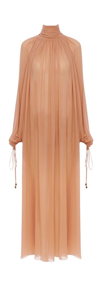 최근 몇 년 사이 떠오른 란제리 트렌드에서 영감을 받은 원피스입니다. 투명하든 불투명하든, 피부와 비슷한 톤의 롱 원피스는 2026년 필수 아이템 중 하나일 거예요. 관능적이면서도 우아한 매력이 있죠. 뮈글러의 미겔 카스트로 프레이타스는 긴소매가 달린 스킨 톤 시스루 롱 원피스를 선보였습니다. 커다란 은색 귀고리가 룩을 완성하는군요.