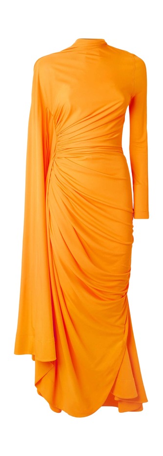 2026년 주목해야 할 색 중 하나가 바로 생기 넘치는 주황색입니다. 이 색을 담은 맥시 원피스를 입으면 별다른 아이템을 더하지 않아도 강렬한 스타일을 완성할 수 있죠. 생 로랑을 이끄는 안토니 바카렐로는 여러 겹 주름 잡은 웅장한 실루엣의 원피스에 주황색을 끼얹어 드라마틱한 분위기를 자아냈습니다.