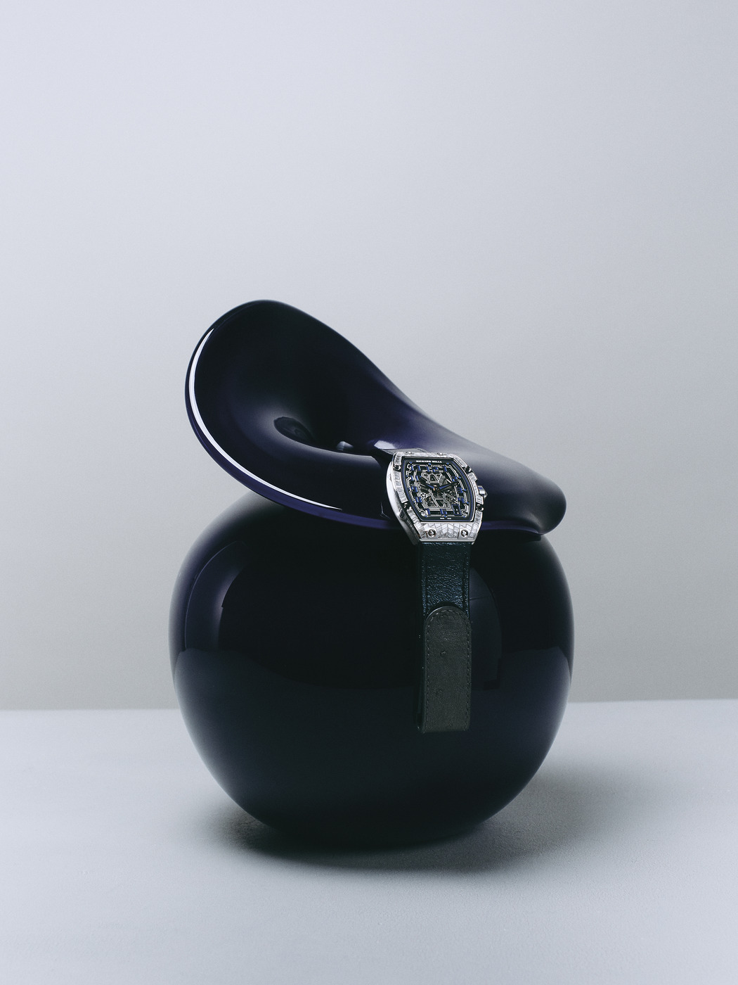 마이크로블라스트 처리된 5등급 티타늄 소재, 플래티넘 로터를 탑재했다. 엑스트라 플랫 스켈레톤 다이얼과 50시간 파워 리저브가 특징인 ‘RM 67-01 오토매틱’ 시계는 리차드 밀(Richard Mille). 검은색 화병은 우그 오브젝트(Oog Objects).