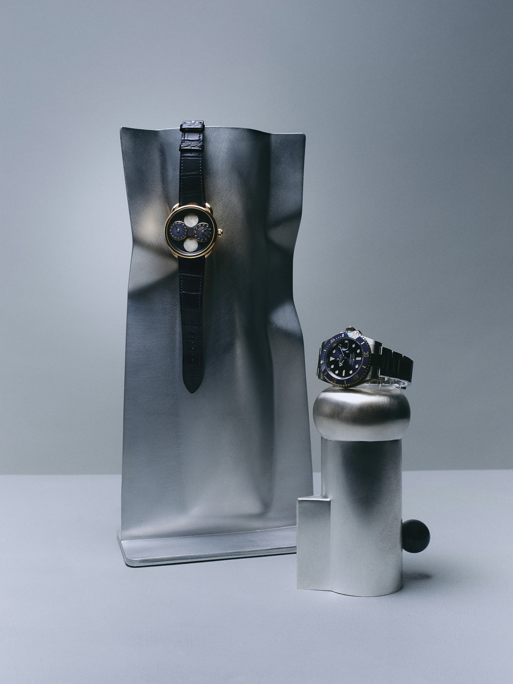 옐로 골드 케이스에 뒤모르티에라이트(Dumortierite) 다이얼과 더블 문페이즈 기능을 탑재한 ‘아쏘 레흐 드 라 룬’ 시계는 에르메스(Hermès), 오이스터 스틸 소재와 옐로 골드로 구성된 ‘서브마리너 데이트’ 시계는 롤렉스(Rolex). 길쭉한 화병은 스튜디오 릴로(Studio Lilo), 우유 단지는 나탈리아 크리아도(Natalia Criado).