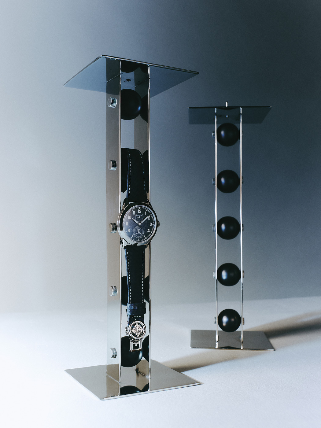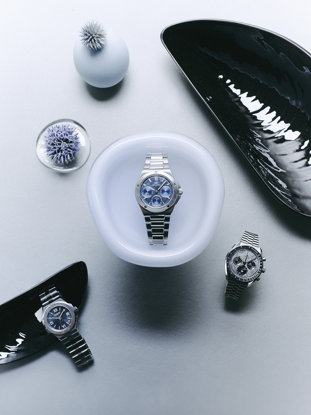 (왼쪽부터) 스테인리스 스틸과 사파이어 크리스털 소재에 전기도금 처리로 얻은 블루 다이얼을 탑재한 ‘알파인 이글 298600-3001 크로노미터’ 시계는 쇼파드(Chopard), 제랄드 젠타(Gérald Genta)의 디자인과 커트 클라우스(Kurt Klaus)의 퍼페추얼 캘린더를 갖춘 ‘인제니어 퍼페추얼 캘린더 41’ 시계는 IWC 샤프하우젠(IWC Schaffhausen). 크로노그래프 3개와 6시 방향 문페이즈 인디케이터가 돋보이는 ‘스피드마스터 문페이즈 메테오라이트’ 시계는 오메가(Omega). 검은색 굴 껍데기 모양 그릇은 세락스(Serax), 유리 방울 오브제는 필라 샤허(Pilar Schacher), 도자기로 만든 거위알은 님펜부르크(Nymphenburg), 흰색 그릇은 우르술라 푸투라(Ursula Futura).