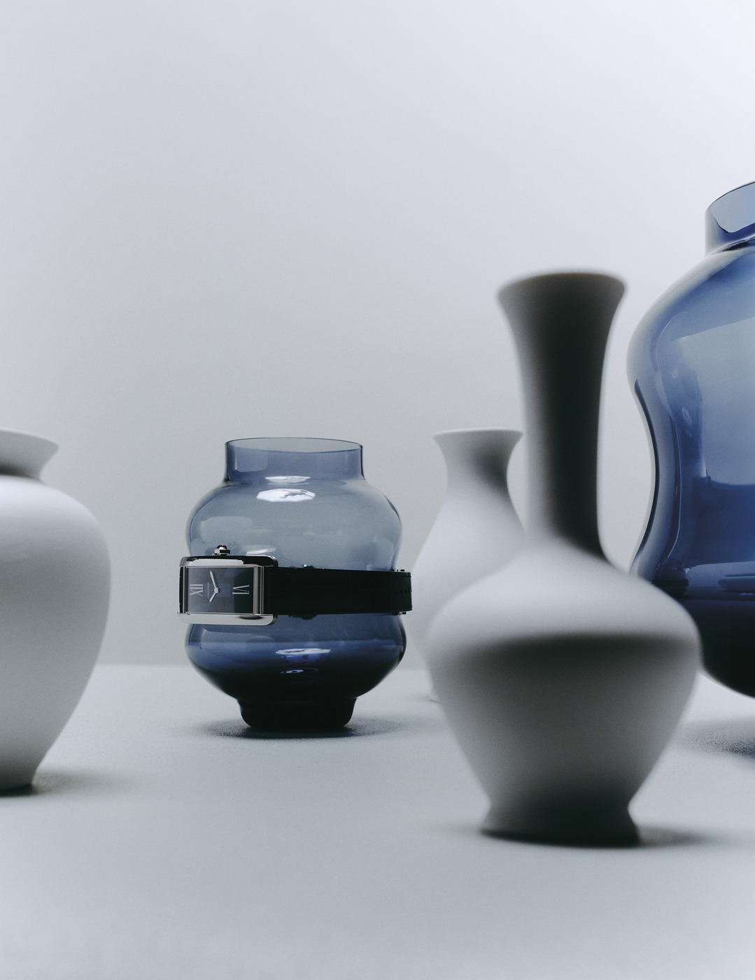 매뉴얼 와인딩 칼리버와 패싯 컷 루비가 세팅된 크라운, 아르데코 스타일에서 영감을 받은 블루 다이얼이 매력적인 ‘탱크 아메리칸’ 시계는 까르띠에(Cartier). 푸른색 ‘마렐드’ 화병은 스벤스크 텐(Svenskt Tenn), 흰색 ‘블라썸’ 화병은 쇤부흐(Schönbuch).
