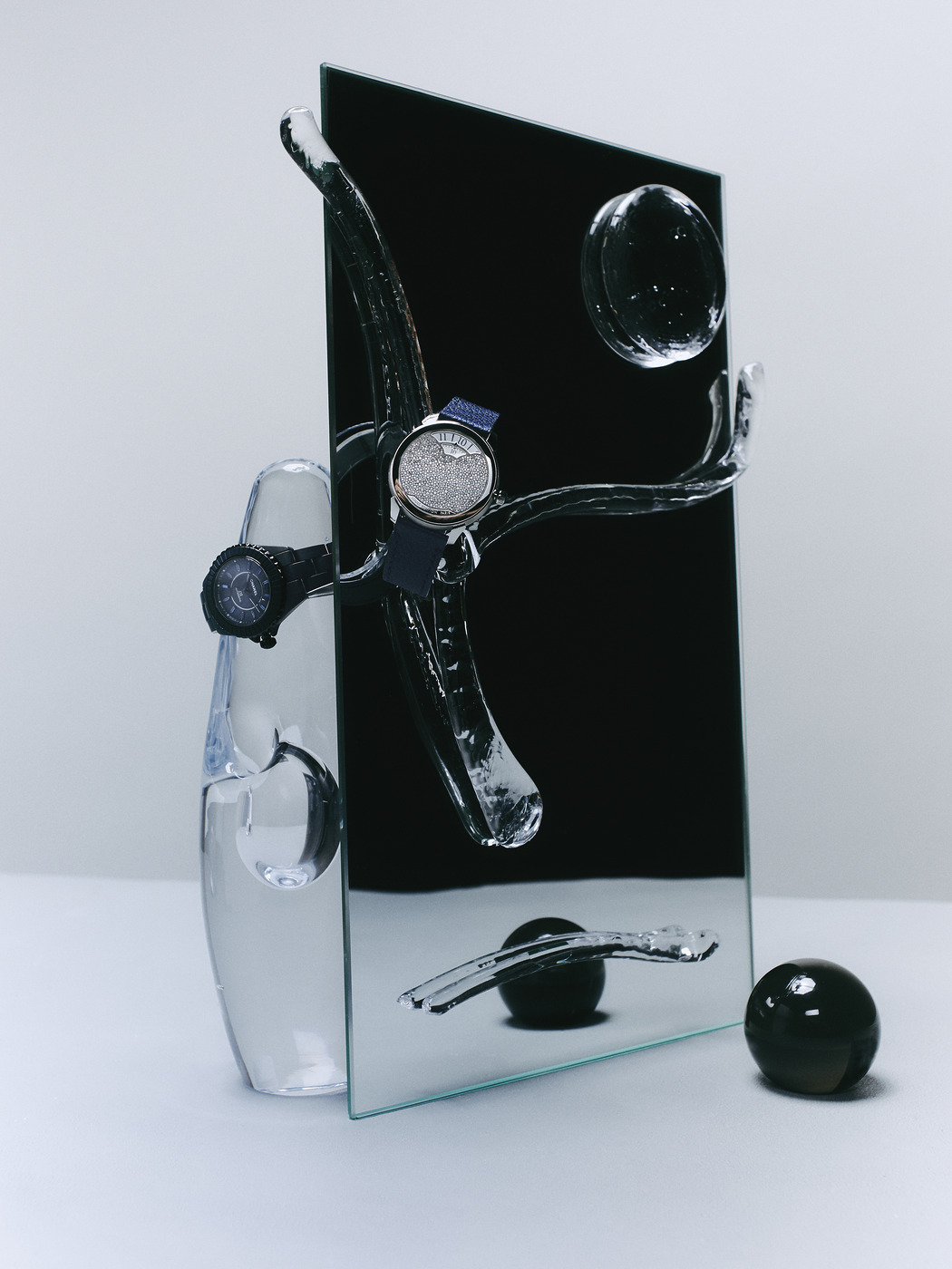 (왼쪽부터) 세라믹과 스틸, 바게트 컷 블루 사파이어 12개로 완성한 ‘J12 블루 33mm’ 시계는 샤넬 워치(Chanel Watches), 플래티넘에 다이아몬드를 촘촘히 더한 ‘땅부르 컨버전스 오토매틱 37mm’ 시계는 루이 비통(Louis Vuitton). 유리로 만든 조각상은 이딸라(Iittala), 거울은 필라 샤허(Pilar Schacher), 검은색 원형 오브제는 솔라레(Solare).