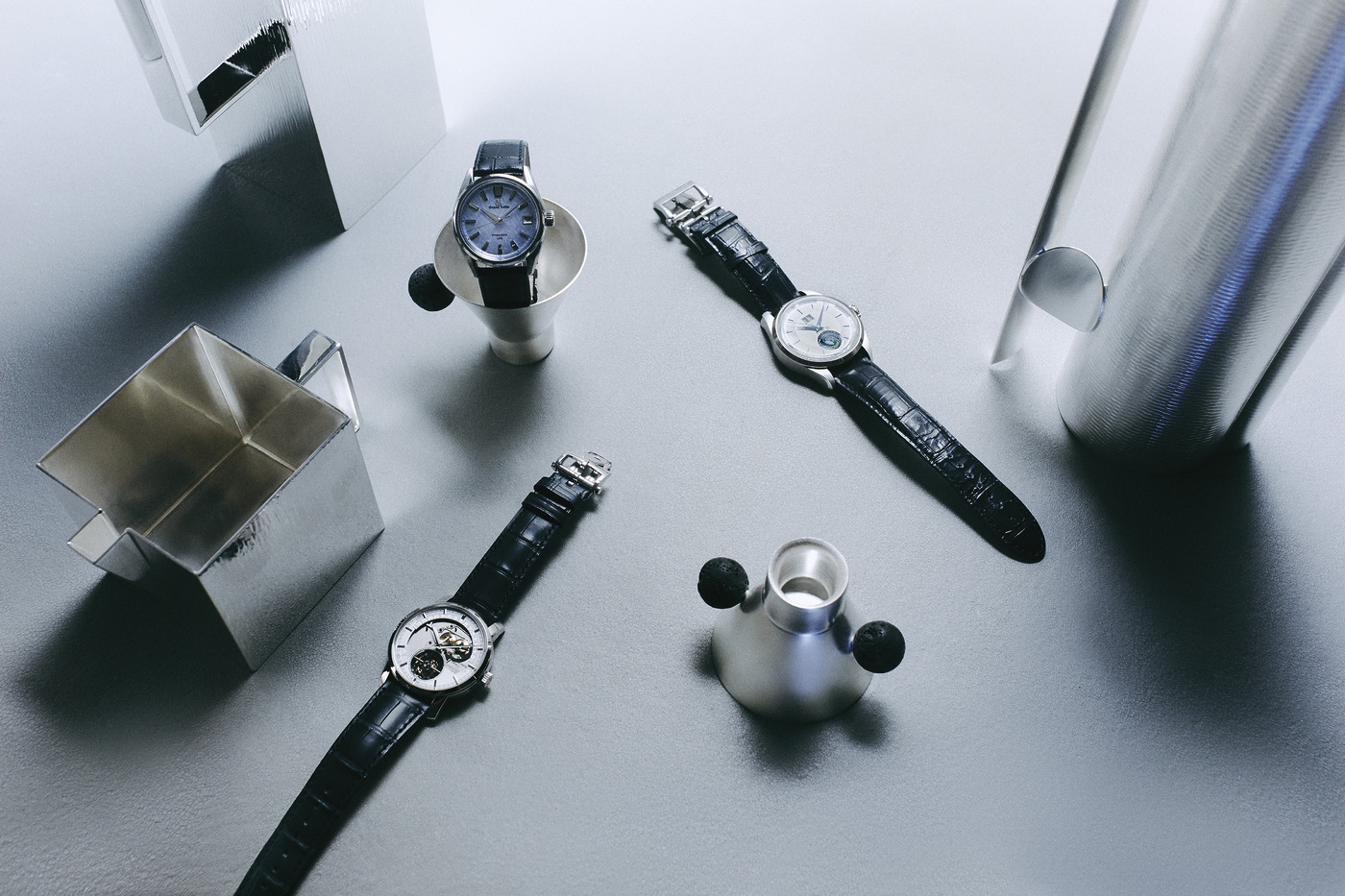 (왼쪽부터 시계 방향으로) 일본 겨울 숲을 묘사한 연한 푸른색 다이얼이 돋보이는 ‘SLGB001 아이스 포레스트' 시계는 그랜드 세이코(Grand Seiko). 6시 방향에 지구 북반구의 모습을 사실적으로 형상화한 글로브 디스크를 탑재한 ‘1858 지오스피어 애뉴얼 캘린더’ 시계는 몽블랑(Montblanc). 플래티넘 소재와 사파이어 케이스 백, 투르비용이 우아하게 조화를 이루는 ‘트래디셔널 투르비용 레트로그레이드 데이트 오픈페이스’ 시계는 바쉐론 콘스탄틴(Vacheron Constantin). 실버 소재 주전자와 우유 단지, 크림 통은 자네토(Zanetto), 촛대와 잔은 나탈리아 크리아도(Natalia Criado).