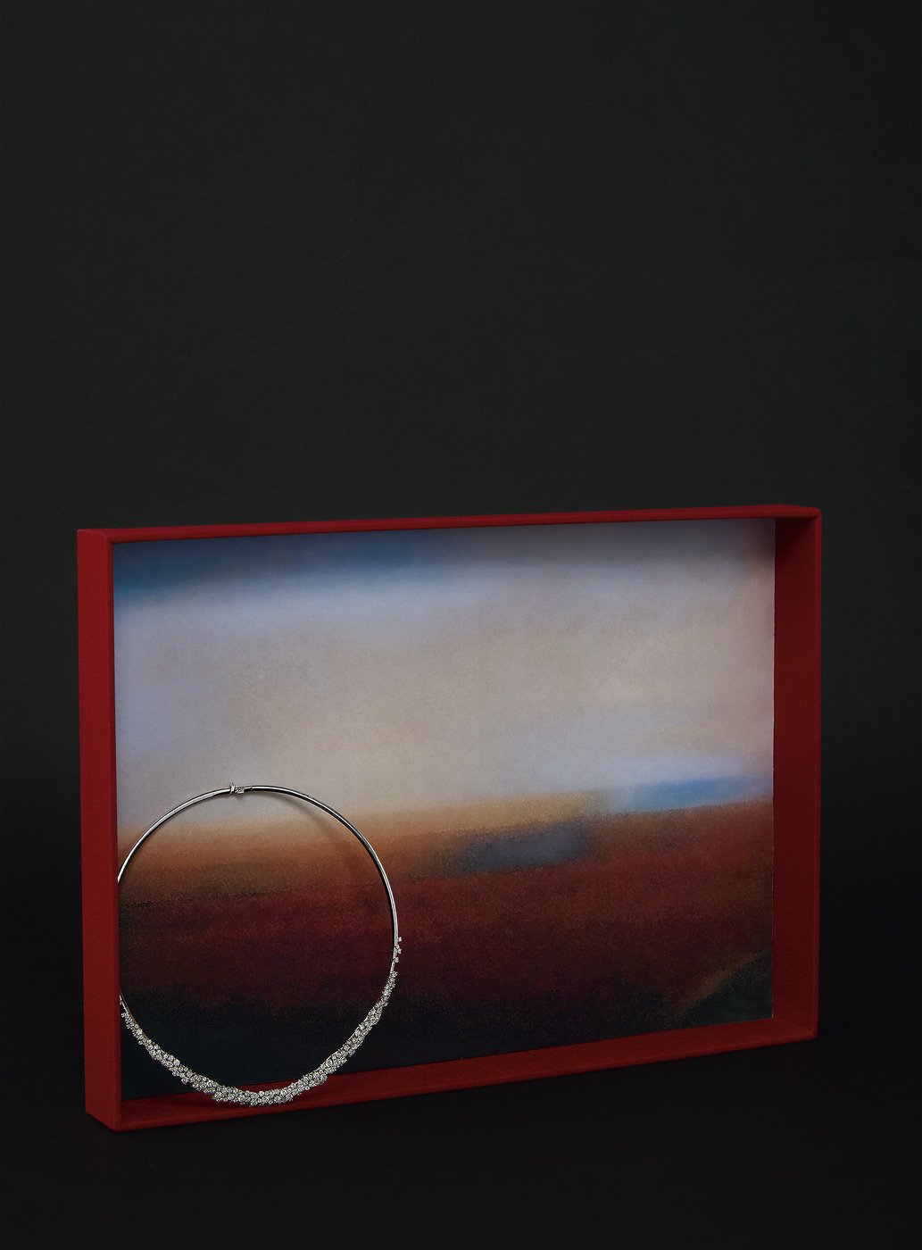 수작업 인그레이빙을 통해 실크처럼 부드러운 촉감을 구현한 ‘루나리아’ 귀고리는 마르코 비체고(Marco Bicego), 표면에 샌드블라스트 기법을 적용한 금도금 실버에 큼직한 레진 장식을 더한 ‘앙샹테’ 반지는 샹트클레르(Chantecler).
