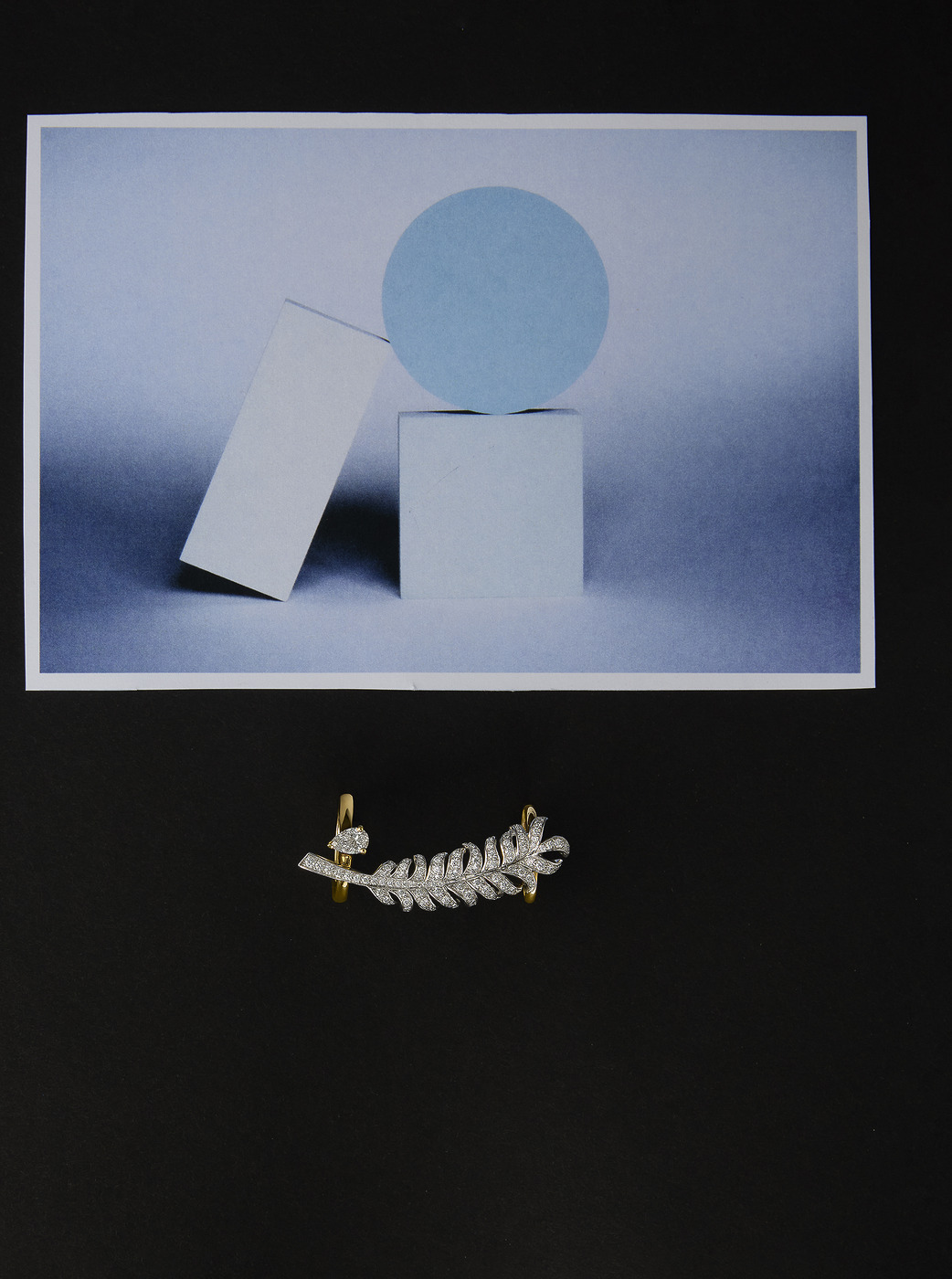 다이아몬드 100개가 눈부시게 빛나는 깃털 모티브와 1.49캐럿의 페어 컷 다이아몬드가 어우러진 ‘플륌 드 샤넬’ 반지는 샤넬 파인 주얼리(Chanel Fine Jewelry). 옐로 골드 밴드 두 개를 한 손가락에 길게 착용한다.