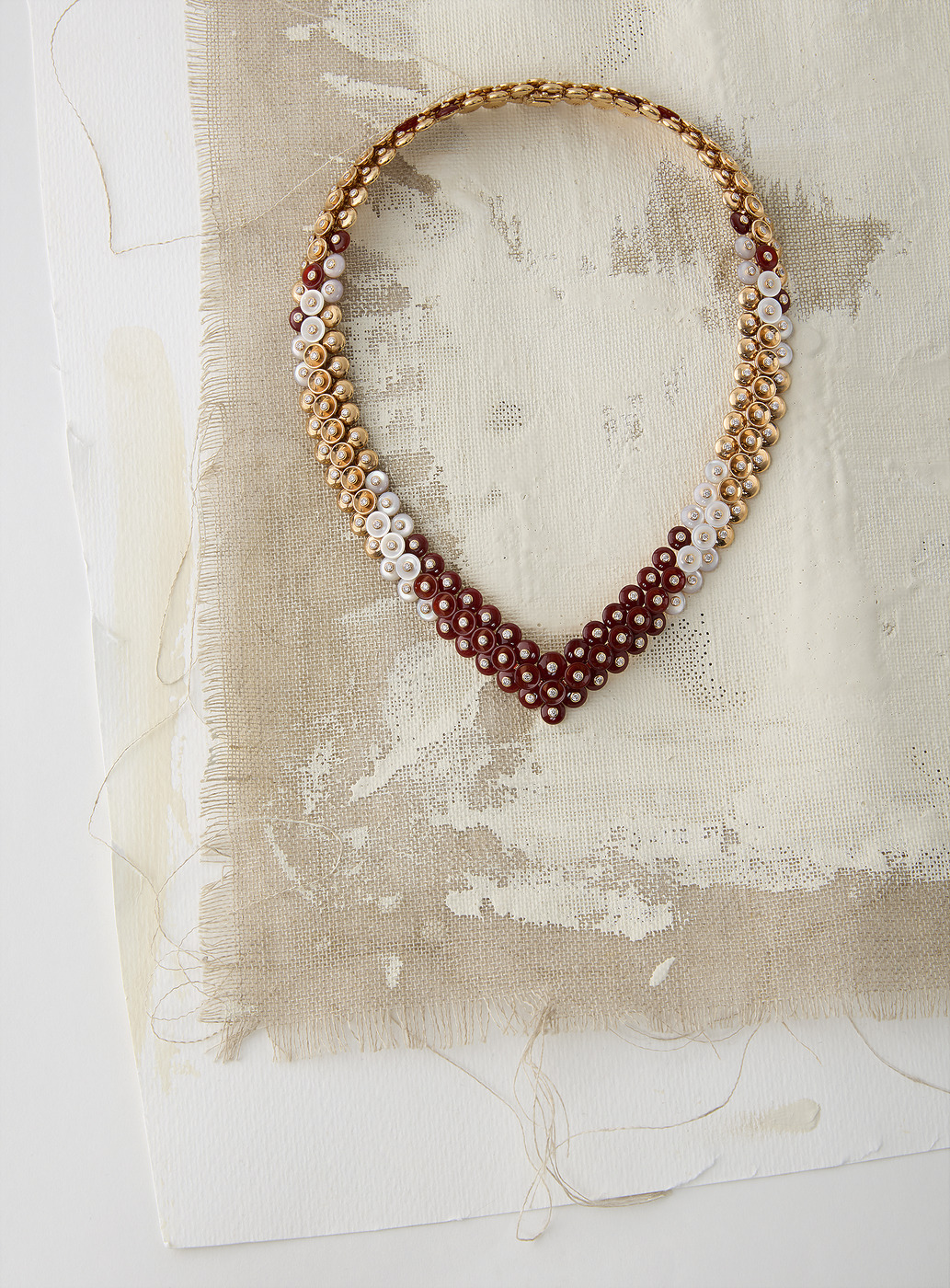 1930년대 후반에 선보인 메종의 아카이브를 재해석했다. 다이아몬드를 품은 단추 형태 카넬리안, 마더 오브 펄, 로즈 골드 모티브가 모여 경쾌한 분위기를 연출한 ‘부통 도르’ 목걸이는 반클리프 아펠(Van Cleef & Arpels).
