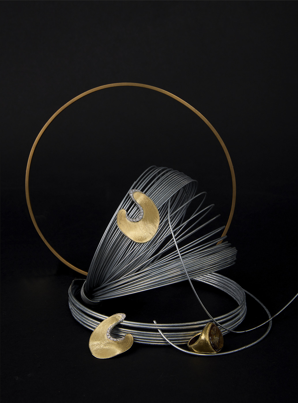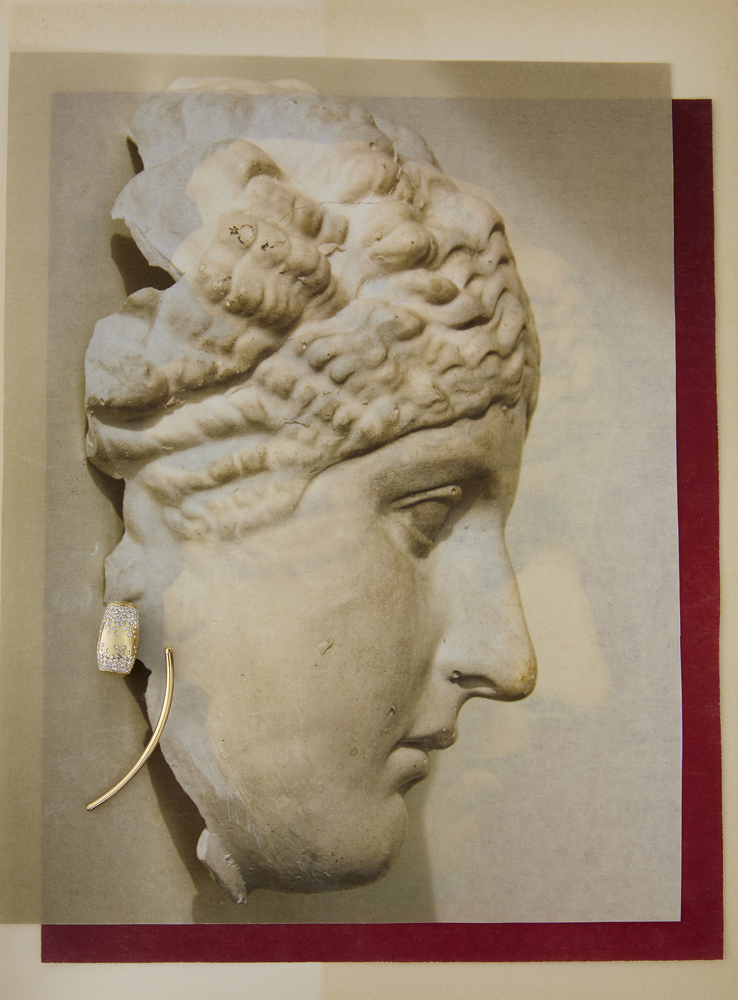 그러데이션 효과의 다이아몬드 세팅이 돋보이는 18K 옐로 골드 소재 ‘러브 네스트’ 귀고리는 포페(Fope), 현대적이면서도 간결한 디자인과 속이 빈 구조 덕분에 놀랍도록 가벼운 ‘플로우’ 귀고리는 마르코 제르벨라(Marco Gerbella).