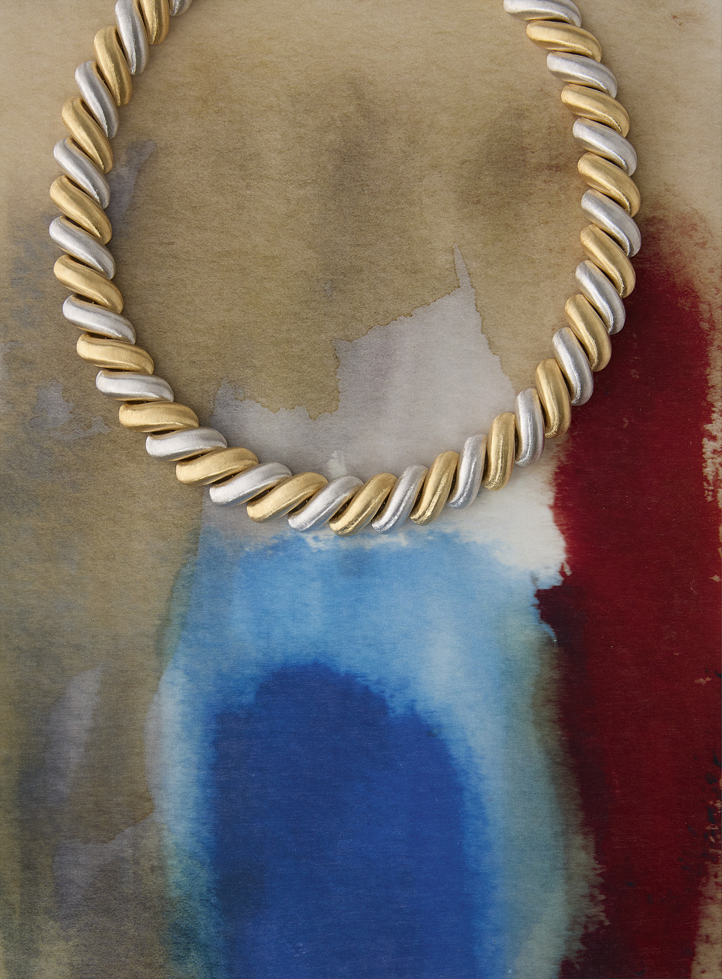 옐로·화이트 골드를 밧줄처럼 꼬아 완성한 ‘토르세이드’ 목걸이는 부첼라티(Buccellati). 고급 원단의 질감을 금으로 표현하는 메종의 혁신과 장인 정신을 보여주는 디자인이다.