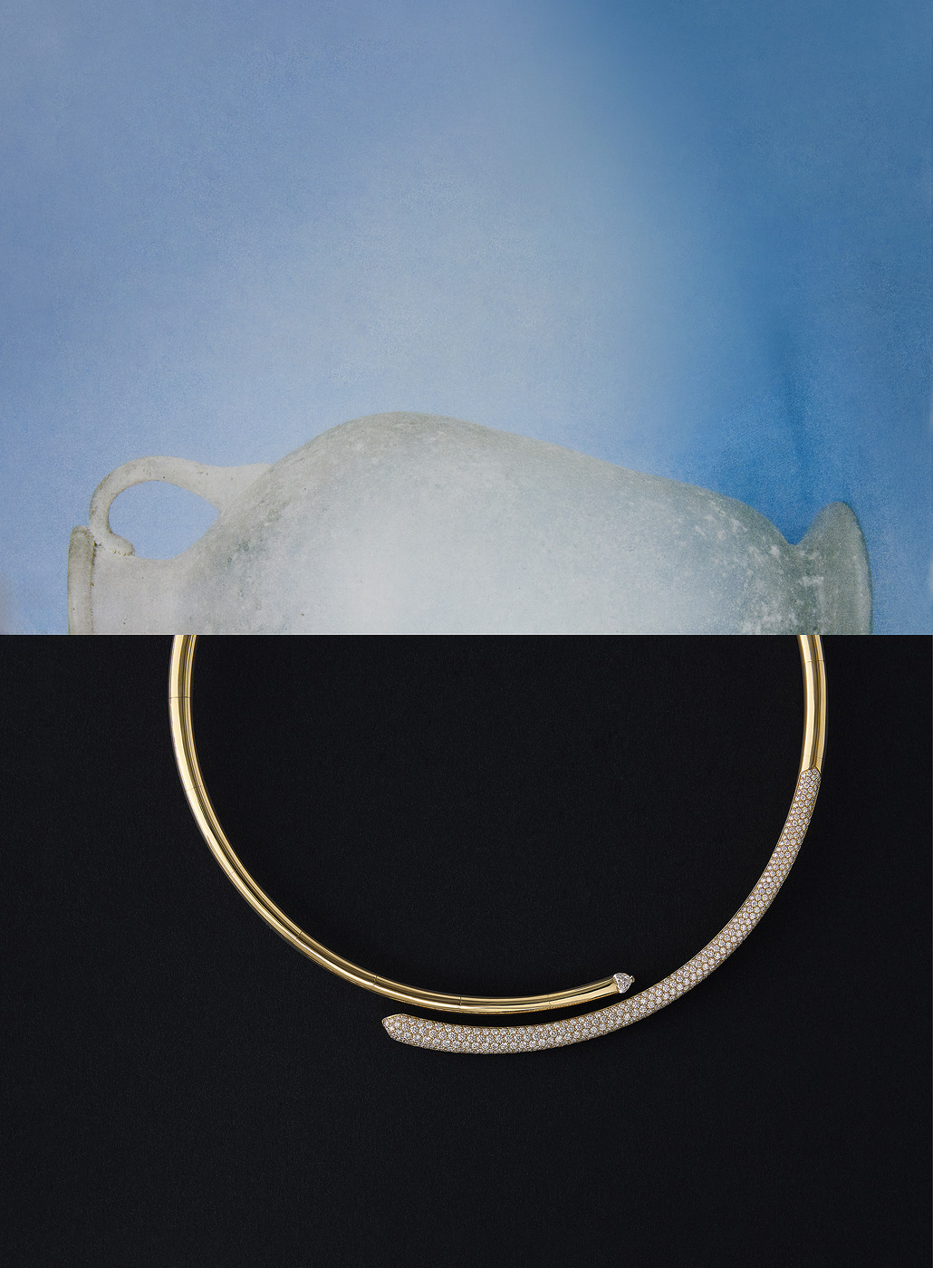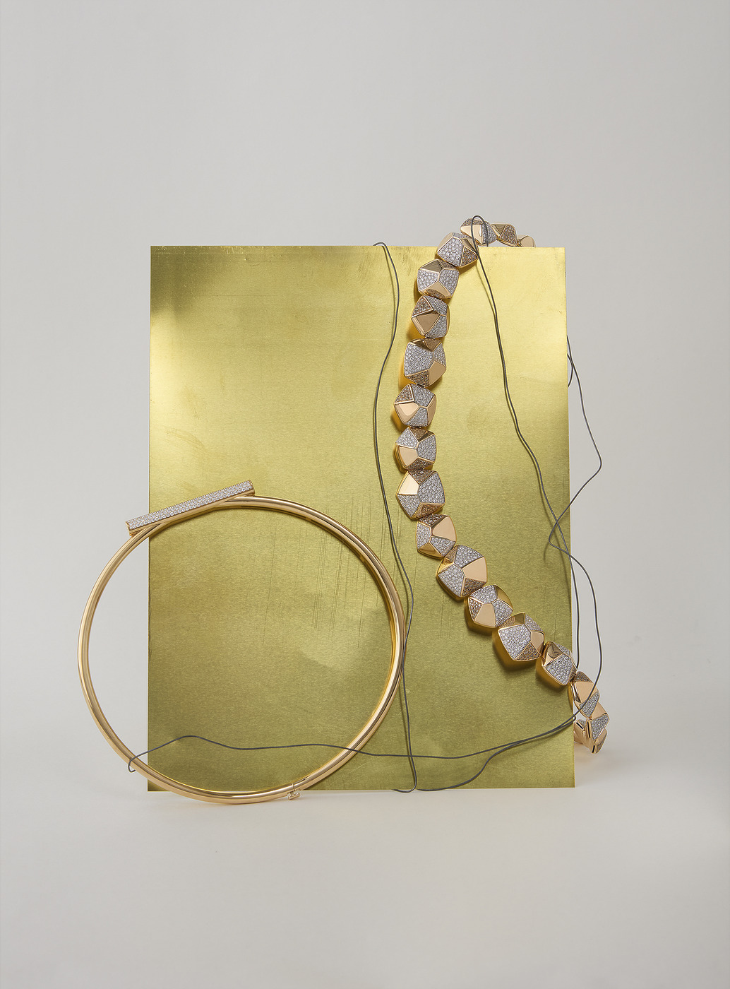 견고한 로즈 골드 프레임에 총 2.23캐럿의 다이아몬드가 빼곡히 박힌 바 장식 ‘도미노’ 리지드(형태가 고정된 하드 타입) 목걸이는 로베르토 코인(Roberto Coin), 기하학에서 영감을 받은 오각형 로즈 골드 모티브에 화이트·브라운 다이아몬드를 파베 세팅해 밀라노 특유의 창의적 에너지를 표현한 ‘펜타고니’ 목걸이는 포멜라토(Pomellato).