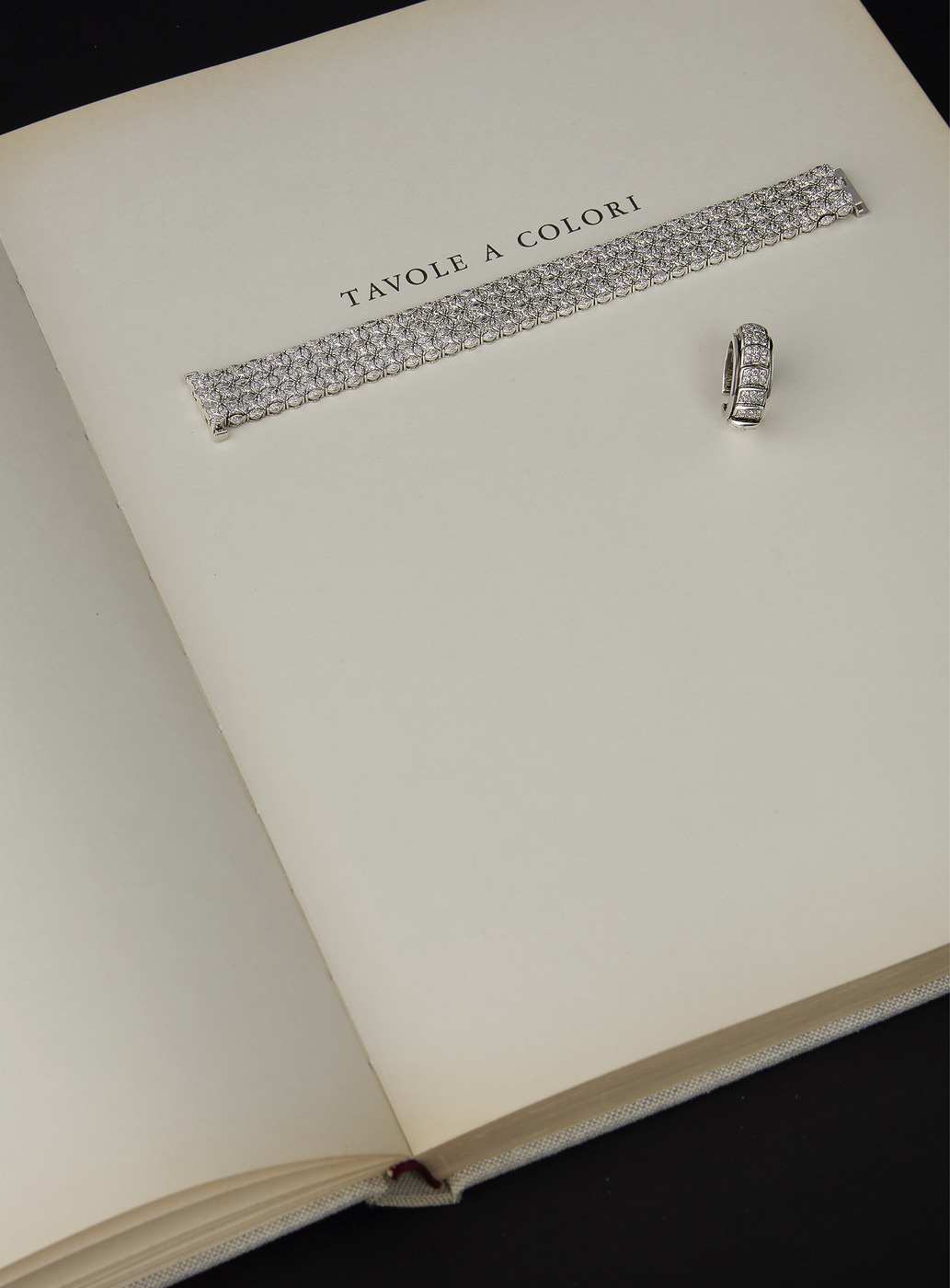 마키즈 컷과 프린세스 컷 다이아몬드로 아름다운 패턴을 구현한 화이트 골드 소재 ‘디아데’ 팔찌는 피사 디아만티(Pisa Diamanti), 다이아몬드로 장식한 화이트 골드 조각이 뱀 비늘을 연상시키는 ‘룩소르’ 반지는 파르네세 조이엘리(Farnese Gioielli).