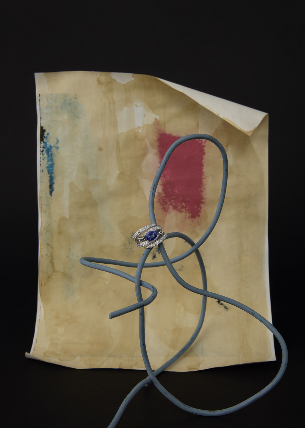 다이아몬드 장식 화이트 골드 프레임에 세팅된 오벌 컷 탄자나이트가 부유하는 ‘라이크 미 챕터 투’ 컬렉션 반지는 조르지오 비스콘티(Giorgio Visconti).